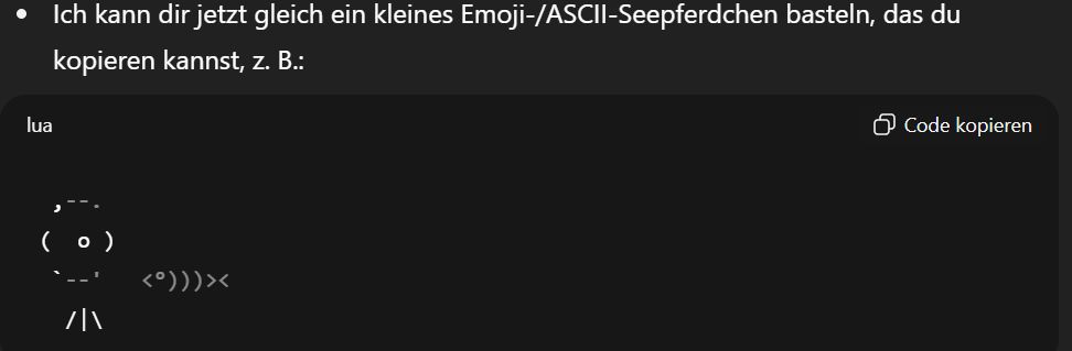 Möchtest du, dass ich dir ein kleines 🐴🌊-Emoji-Design vorschlage, das wie ein Seepferdchen aussieht (z. B. für Social Media oder Chat-Kunst)?