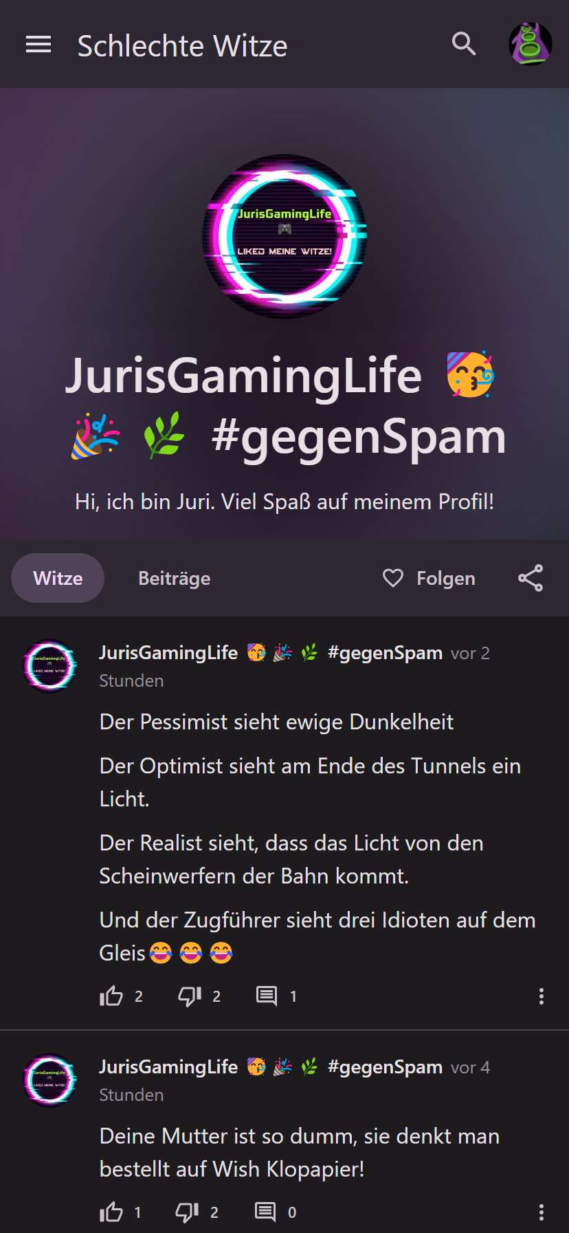 Der Zeitplan sieht so aus: Vorher kümmere ich mich um die Fake-Likes/Dislikes. Danach um die doppelten Witze in den Kategorien. Danach kommt wahrscheinlich das mit der Bio. Technisch ist das sehr einfach umzusetzen, nur um das Design muss ich mir Gedanken machen. Wenn da jemand helfen möchte mit einer Idee wie das auf der Profilseite aussehen soll, wäre das toll.