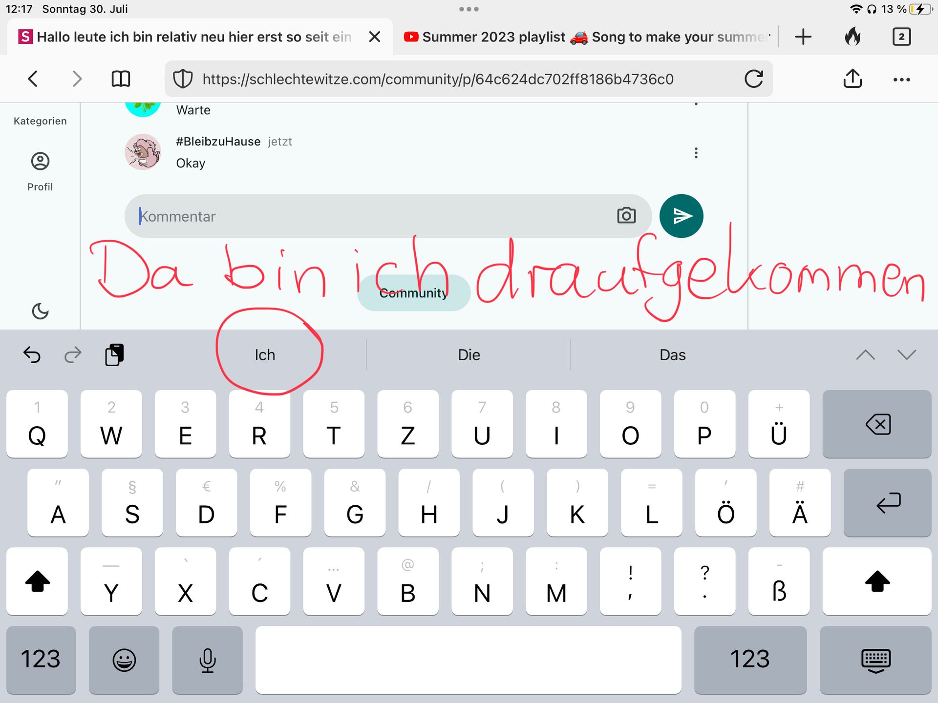 Da stand "Ich", ich dachte du wolltest wieder was schreiben, hast es dann ausversehen wieder abgeschickt