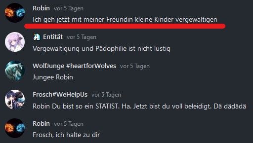 Robin, ich hatte einen sehr fragwürdigen Kommentar von dir gelesen, mit dem Inhalt (falls ich den noch richtig in Erinnerung habe): „Ich geh' dann Mal Kinder vergew*ltigen“, oder so. Über sowas macht man keine Scherze, aber ich bin leicht irritiert und neugierig.