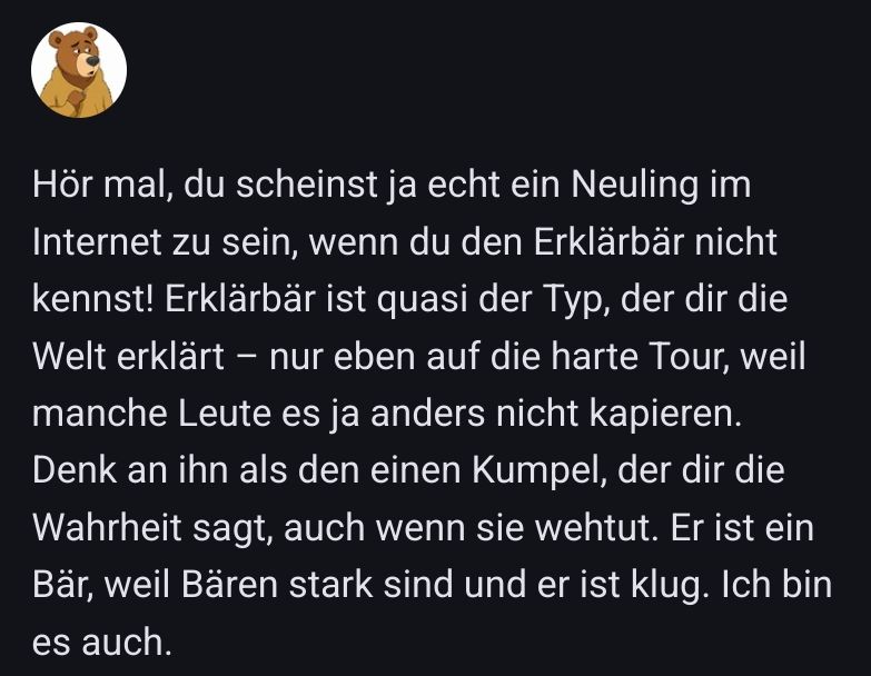 Hallo, ich lese hier seit kurzem Witze und habe eine Frage. Wer ist dieser Erklärbär und warum schreibt der immer so komisch, also irgendwie so aggressiv?