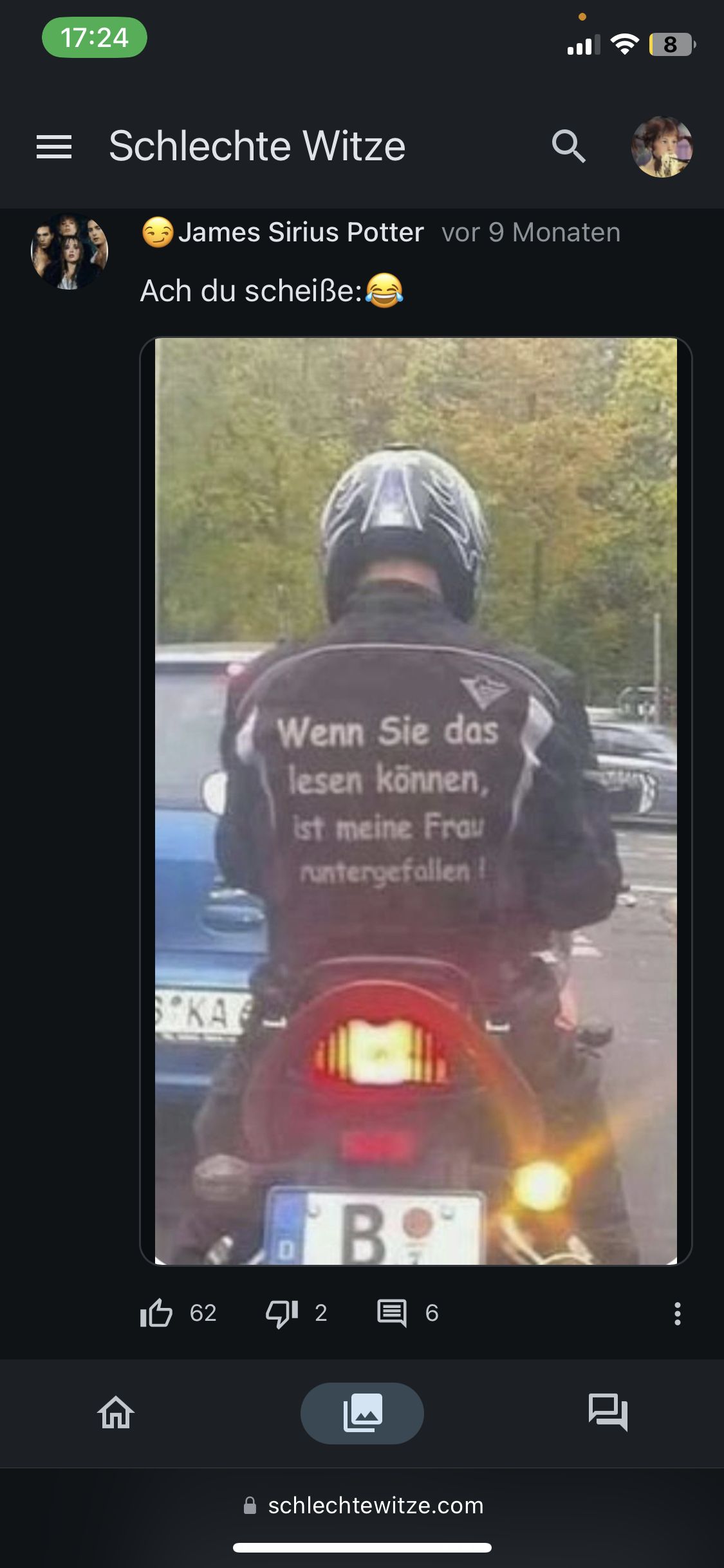 Das ist also ein meme, ein Foto von einem Motorradfahrer mit einem Witz seiner Jacke