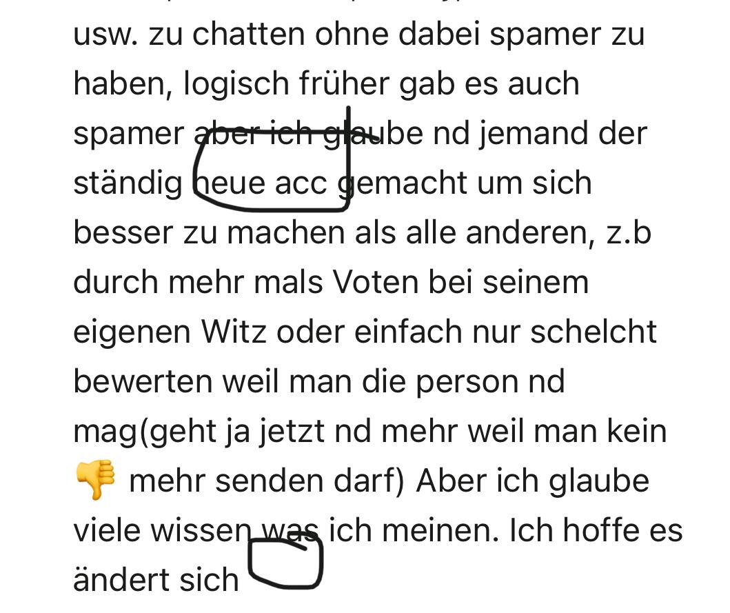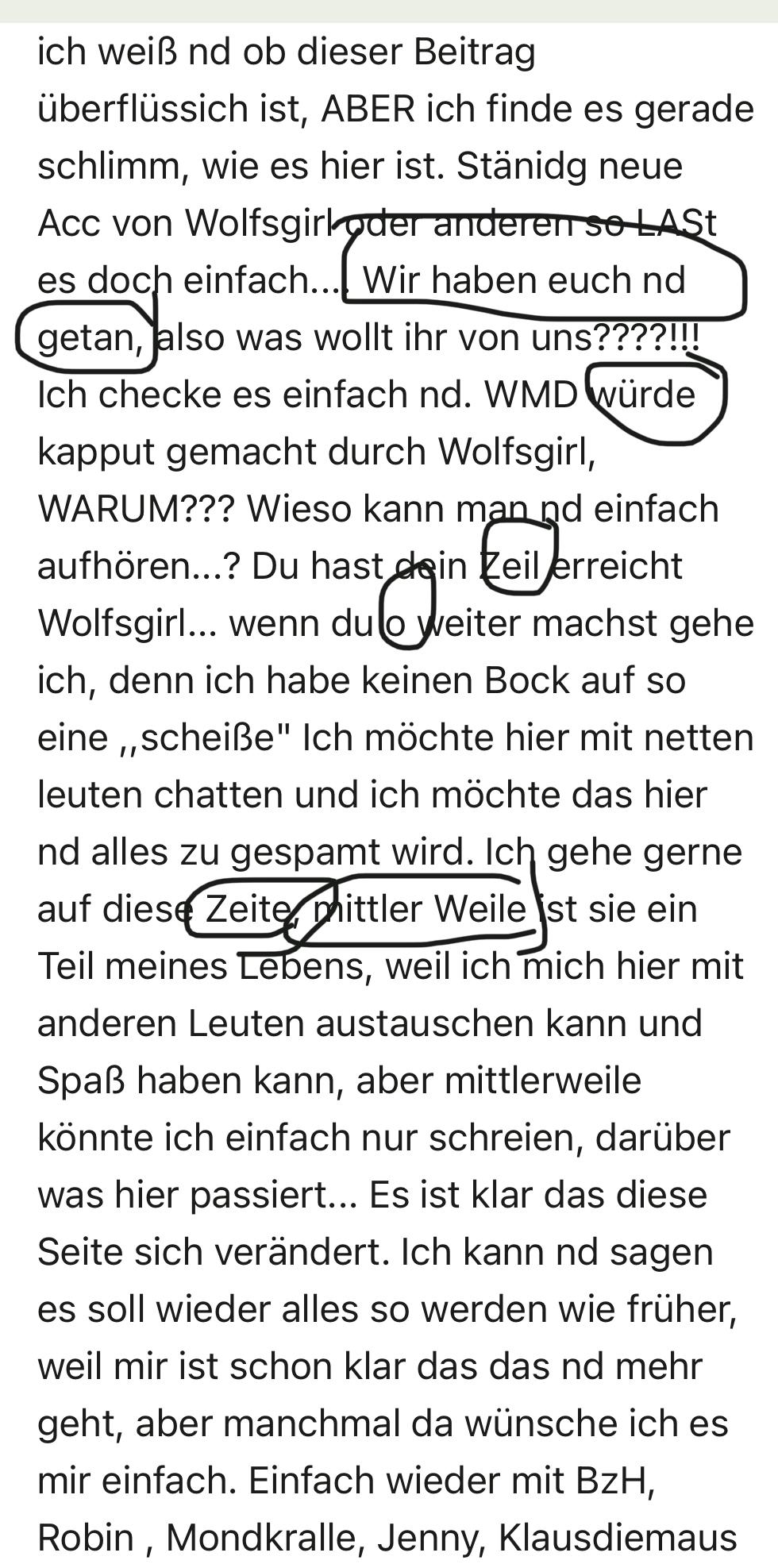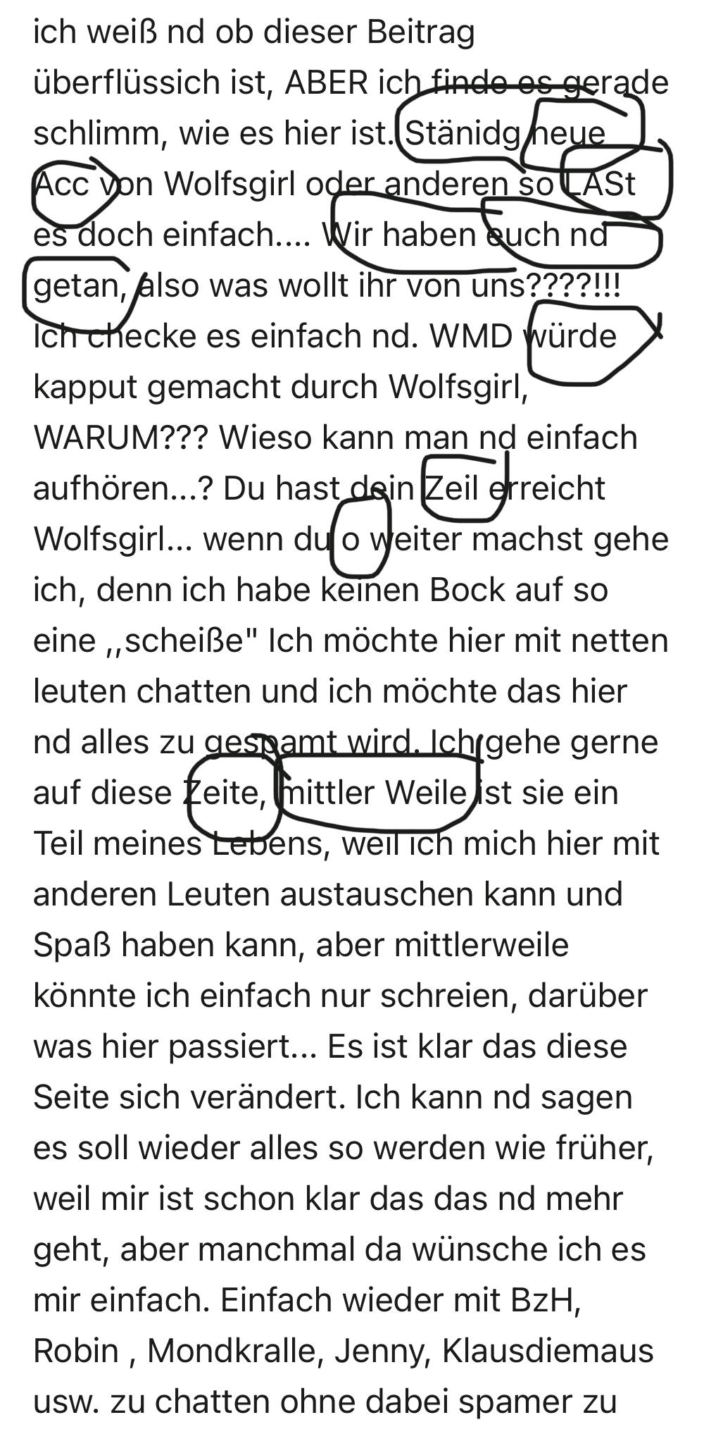 ich weiß nd ob dieser Beitrag überflüssich ist, ABER ich finde es gerade schlimm, wie es hier ist. Stänidg neue Acc von Wolfsgirl oder anderen so LASt es doch einfach.... Wir haben euch nd getan, also was wollt ihr von uns????!!! Ich checke es einfach nd. WMD würde kapput gemacht durch Wolfsgirl, WARUM??? Wieso kann man nd einfach aufhören...? Du hast dein Zeil erreicht Wolfsgirl... wenn du o weiter machst gehe ich, denn ich habe keinen Bock auf so eine ,,scheiße" Ich möchte hier mit netten leuten chatten und ich möchte das hier nd alles zu gespamt wird. Ich gehe gerne auf diese Zeite, mittler Weile ist sie ein Teil meines Lebens, weil ich mich hier mit anderen Leuten austauschen kann und Spaß haben kann, aber mittlerweile könnte ich einfach nur schreien, darüber was hier passiert... Es ist klar das diese Seite sich verändert. Ich kann nd sagen es soll wieder alles so werden wie früher, weil mir ist schon klar das das nd mehr geht, aber manchmal da wünsche ich es mir einfach. Einfach wieder mit BzH, Robin , Mondkralle, Jenny, Klausdiemaus usw. zu chatten ohne dabei spamer zu haben, logisch früher gab es auch spamer aber ich glaube nd jemand der ständig neue acc gemacht um sich besser zu machen als alle anderen, z.b durch mehr mals Voten bei seinem eigenen Witz oder einfach nur schelcht bewerten weil man die person nd mag(geht ja jetzt nd mehr weil man kein 👎 mehr senden darf) Aber ich glaube viele wissen was ich meinen. Ich hoffe es ändert sich