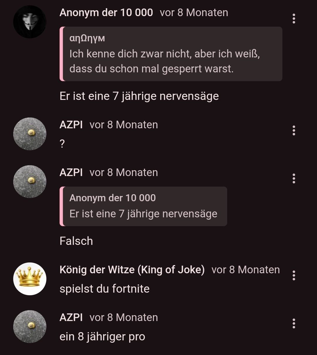 Falls wir das können. Stell dir vor, du bist ein 9- oder 10jähriges Kiddie, und fühlst dich wie King Louie, weil du ja mit den Großen im Internet abhängst. Und wenn dir hier einer von uns Widerworte gibt, dann kann es dir auch nicht wirklich was anhaben. Du kannst ja weiterhin bei den Großen dazwischenquatschen, Beleidigen, Auf die Nerven gehen usw., wofür du dir von Angesicht zu Angesicht längst eine gefangen hättest.