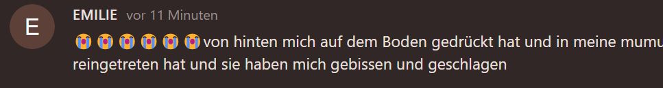 EEMILIEvor 3 Jahren😭😭😭😭😭😭von hinten mich auf dem Boden gedrückt hat und in meine mumu reingetreten hat und sie haben mich gebissen und geschlagen