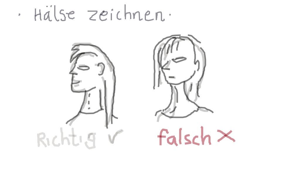 Was oft beim Zeichnen von Köpfen/Hälsen falsch gemacht wird, ist, dass der menschliche Hals nicht gerade gezeichnet wird, sondern in Richtung des Kopfes gebogen. Das ist falsch. Man erkennt einen deutlichen Unterschied wenn man diese zwei Bilder ansieht. Der Hals eines Menschen ist gerade und setzt auch nicht vor dem Kinn an.