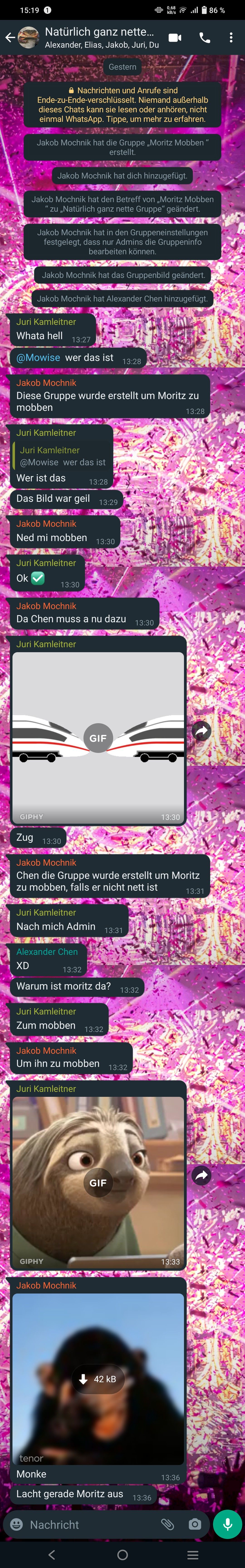 Will ich eigentlich nicht, aber wenn dann mach ich es und nicht ihr. Ja die Gruppe is komisch, vorallem ich bin drin damit sie mich mobben können, und wenn ich raus gehe hab jch ja keine Beweise dass sie es machen. Das steht da drin mehr nicht, sie benutzen es seit 2 wochen nimmer. Die anderen sind da so drinnen, nur Jakob und juri machen das.