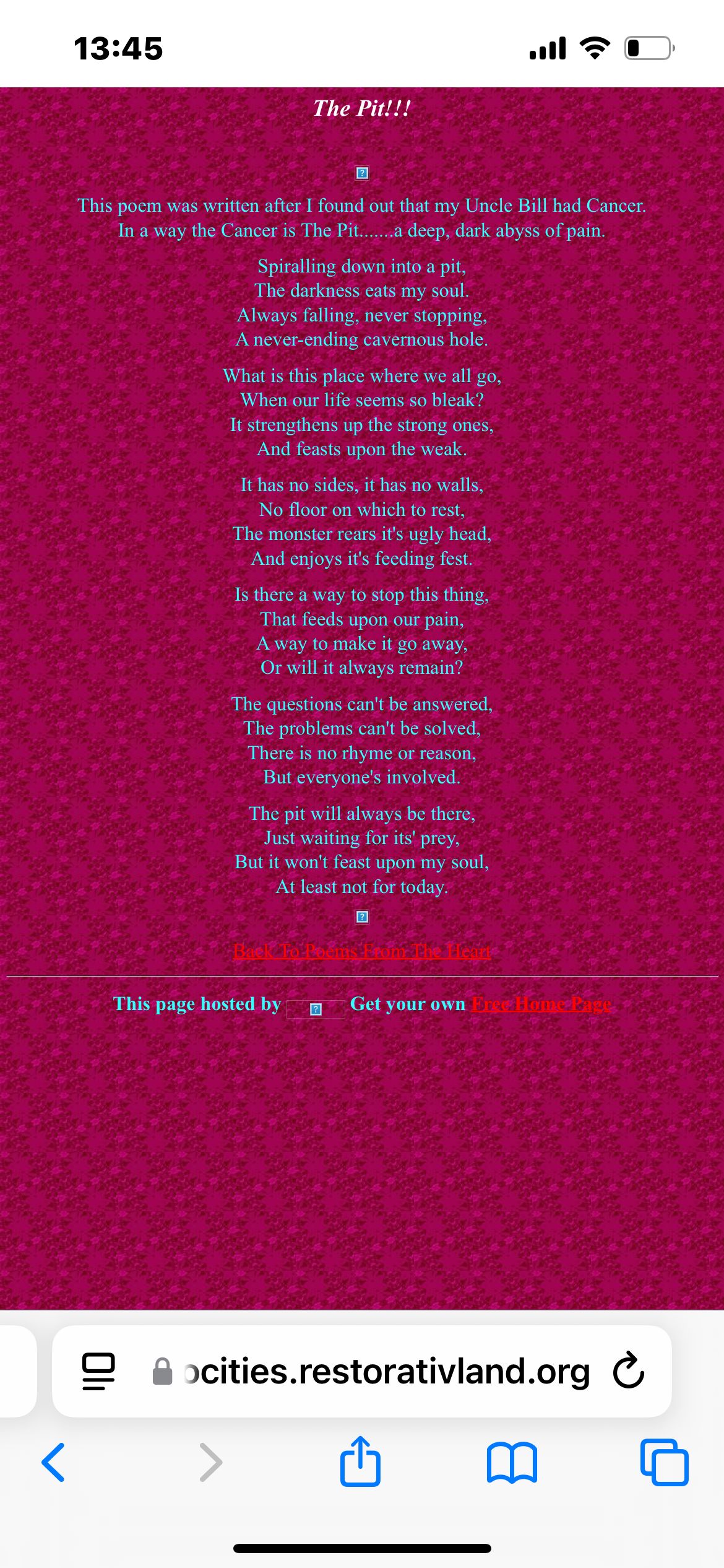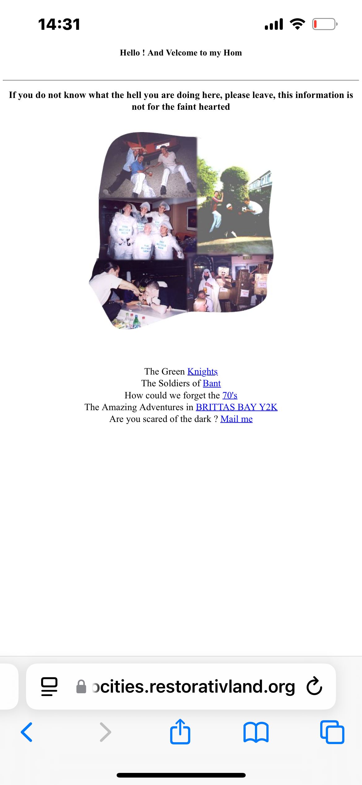 Geo cities ist so cool. Da sind so 20 Jährige alte Webpages von Leuten die das damals gemacht haben. Guck euch das an bitte die Seite