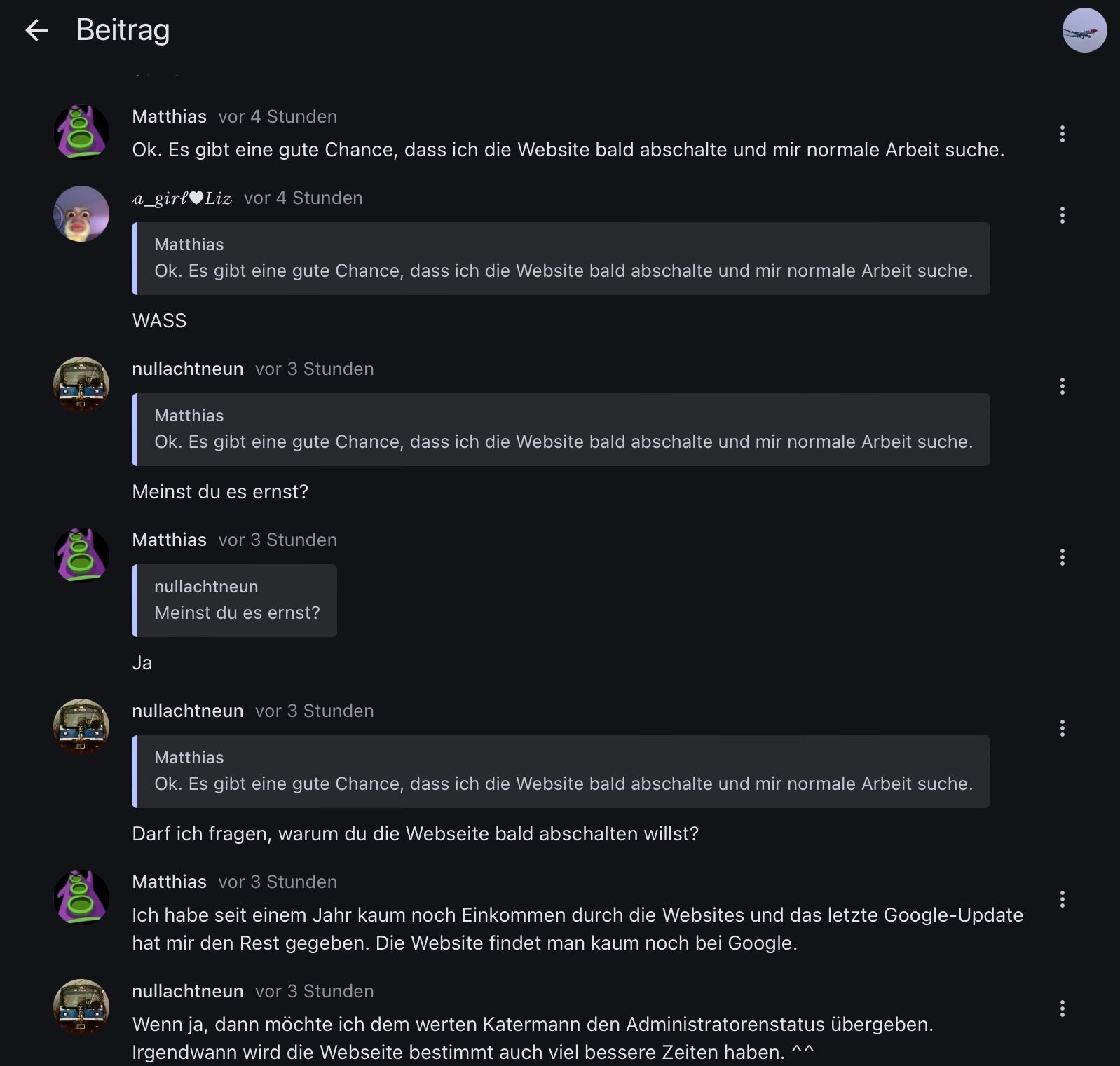 Das Problem ist halt. Ich hab auch bei weitem nicht mehr so Spaß auf dieser Seite. Das liegt erstens vielleicht an meinem Alter, zweitens daran das viele weg sind, daran das die Chats langweilig sind, das Alter runtergegangen ist. Deswegen ist es mir, so gefühllos es auch klingt ziemlich egal ob es die Seite weiterhin gibt oder nicht. Traurig wäre es schon, aber es wäre auch okay dieses Kapitel abzuschließen, weil ich sowieso kaum hier bin