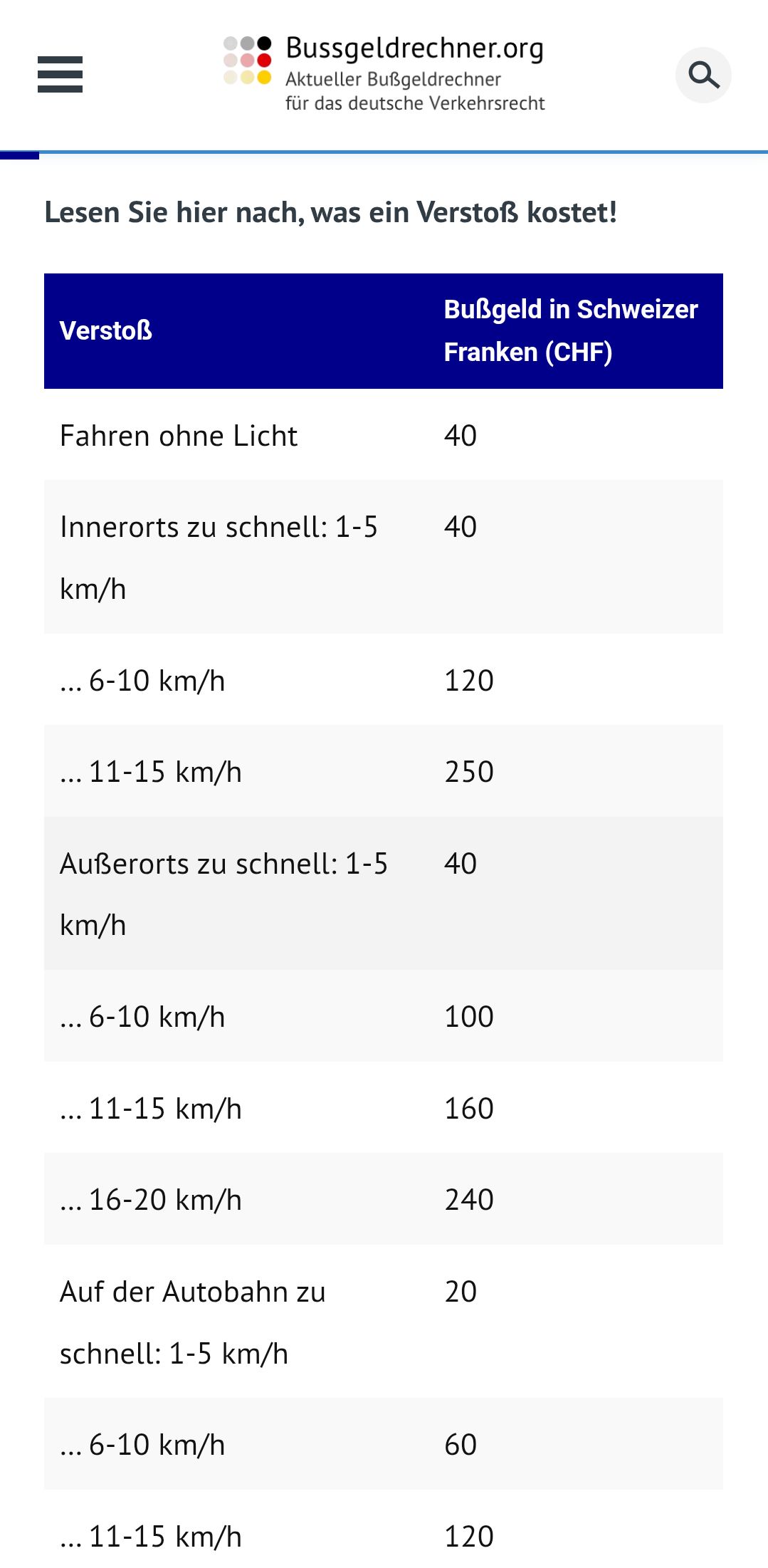 Ab 5 km/h wird gebüsst, und dann nur mit einer strafe von 40 CHF