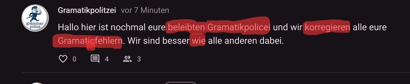 Hallo hier ist nochmal eure beleibten Gramatikpolicei und wir korregieren alle eure Gramaticfehlern. Wir sind besser wie alle anderen dabei.
