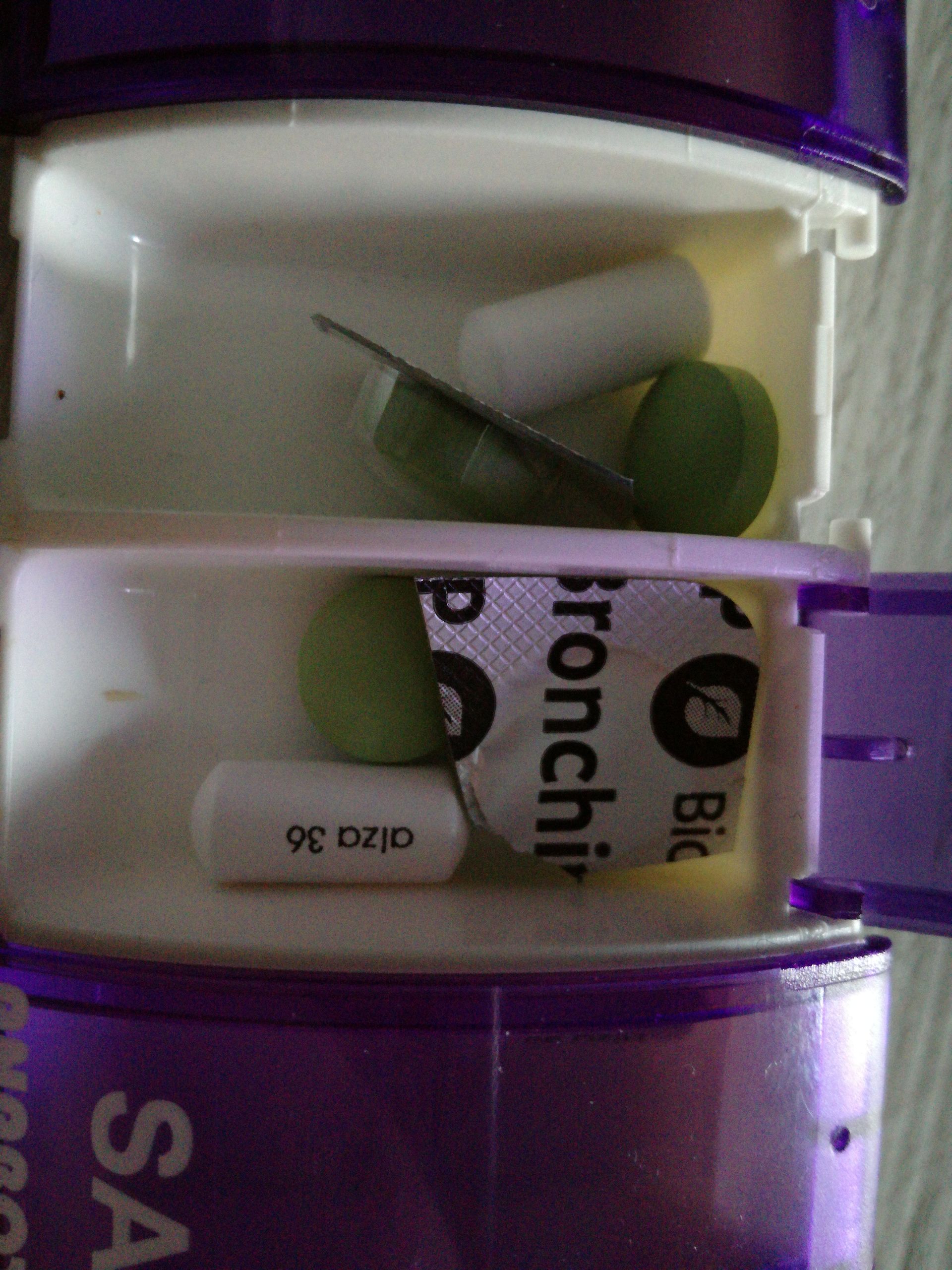 Pro Tag ein Fach. Dazu Gelymentol, Paracetamol, Zinktabletten, Brausezitrone in Wasser, Wasser mit Honig, Olbas und Hedelix Hedelix