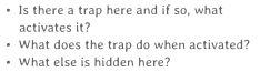 Ach Sauron, du Trottel. Rodario hat doch schon die erste Frage übersetzt, du Blindfisch. Was soll ich da noch übersetzen? "Gepasst hat" eher dein Hirn, als du diesen Unsinn hier geschrieben hast. Steht doch da, Schwarz auf Weiß: "Ist hier eine Falle, und wenn ja wie wird sie ausgelöst?" Man muss kein Genie sein, um das zu raffen. Wirklich nicht.