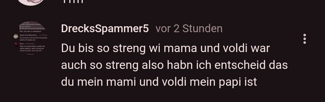 Du bis so streng wi mama und voldi war auch so streng also habn ich entscheid das du mein mami und voldi mein papi ist