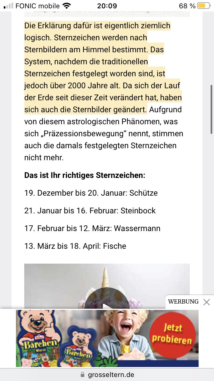 Die Sternzeichen wurden vor gut 2000 Jahren festgelegt, und da die Bahn der Erde sich auch verschiebt, stimmen die Sternzeichen manchmal nicht mehr. Es stimmt also