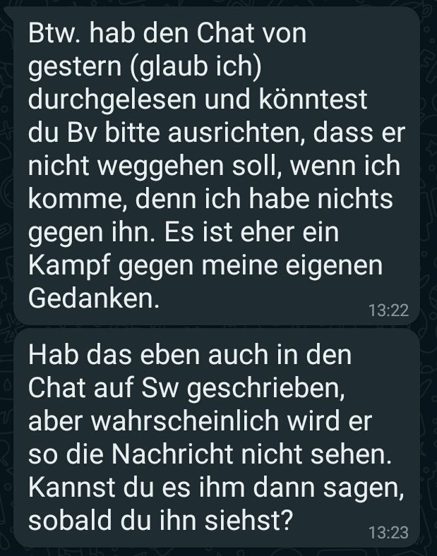 Btw. hab den Chat von gestern (glaub ich) durchgelesen und könntet ihr Bv bitte ausrichten, dass er nicht weggehen soll, wenn ich komme, denn ich habe nichts gegen ihn. Es ist eher ein Kampf gegen meine eigenen Gedanken.