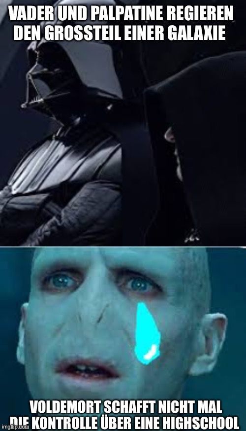 a) Voldemort und Palpatine hatten verschiedene Startbedingungen b) Bei Harry Potter gibt es halt nur England, nicht eine ganze Galaxie c) Palpatine hat genauso versagt wie Voldemort d) Man kann nicht feststellen, wie gut eine Reihe ist, indem man vergleicht, wie stark die verschiedenen Seiten sind e) Dieses Meme von dir ist trügerisch, denn bei Voldemort setzt es nach seinem Fall ein und bei Palpatine vor seinem Fall; das ist nichtsaussagend, und selbst wenn man sie auf dem Höhepunkt ihrer Macht vergleichen würde hätten sie immer noch andere Startbedingungen, und seine hat Voldemort voll ausgenutzt f) Und wenn man nicht die Antagonisten, sondern die Protagonisten vergleicht, muss man feststellen, dass die Zauberer Voldemort schneller, gründlicher und effizienter bekämpft haben als die Jedi Palpatine