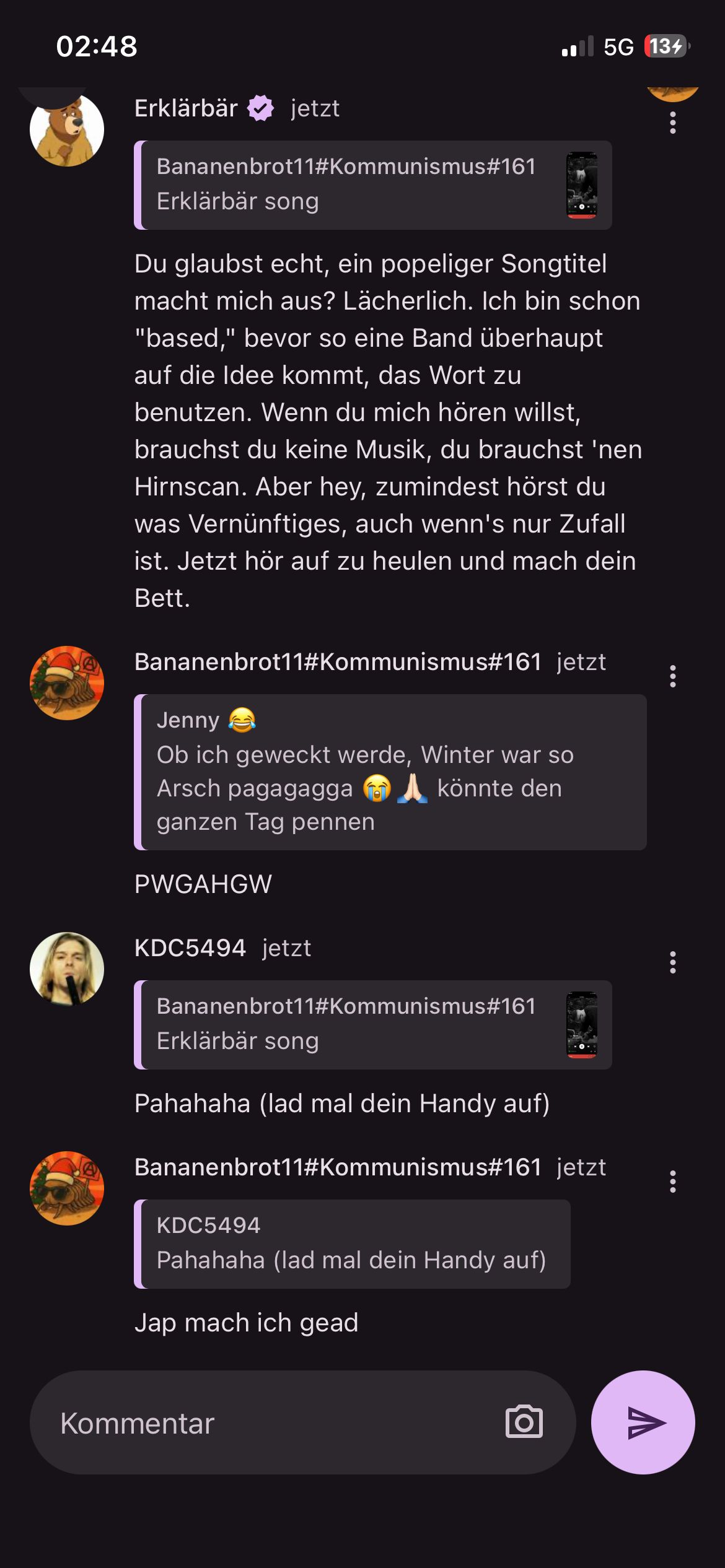 Du glaubst echt, ein popeliger Songtitel macht mich aus? Lächerlich. Ich bin schon "based," bevor so eine Band überhaupt auf die Idee kommt, das Wort zu benutzen. Wenn du mich hören willst, brauchst du keine Musik, du brauchst 'nen Hirnscan. Aber hey, zumindest hörst du was Vernünftiges, auch wenn's nur Zufall ist. Jetzt hör auf zu heulen und mach dein Bett.