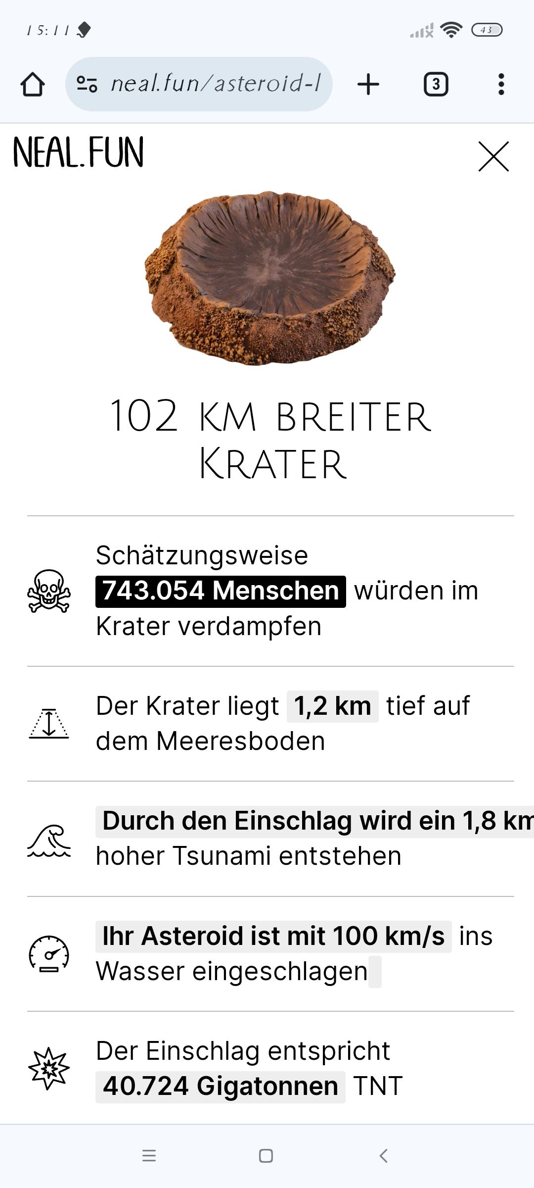 Da kannst du Weltkarte aufmachen und Asteroiden drauf fallen lassen auf einem Ort wo du willst