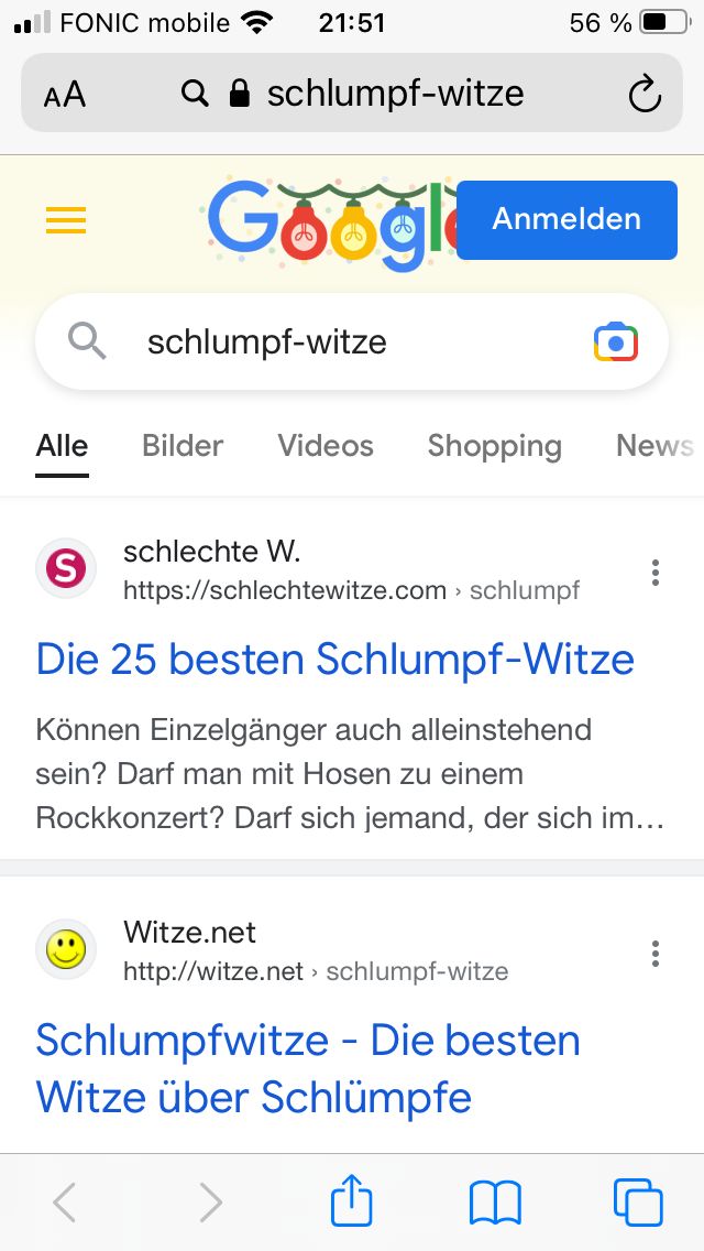 Ich hab aus irgendeinem Grund „Schlumpf-Witze“ gegoogelt und dann hat er mir die Kategorie Schlumpf-Witze auf der Website hier vorgeschlagen… und dann bin ich hängen geblieben