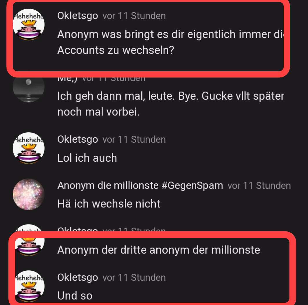 Anonym der drittevor 3 JahrenIch bin Anonym der dritte.Ich habe mehrere Accounts:Anonym der dritte (mein haupt acc)Anonym der vierte (Account am Pc)Anonymderdritteversuchtdenlängstenna (nur joke acc)Inkognito (ja der war ich)Und Anonym der millionste ist eine andere person. Wir sind nicht die gleichen.