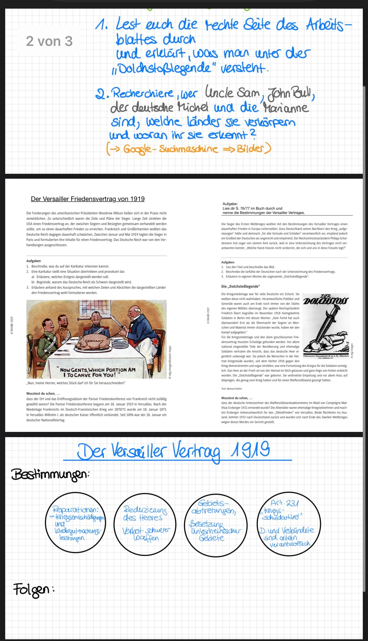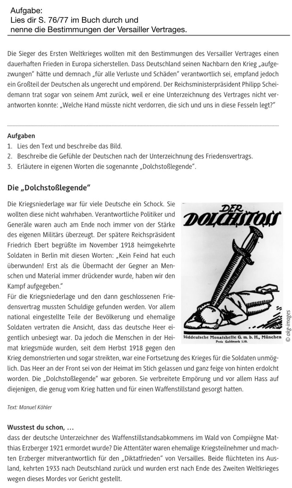 2. Infos zur Dolchstoßlegende (aus dem Text) – mit Bezug zum Versailler Vertrag: