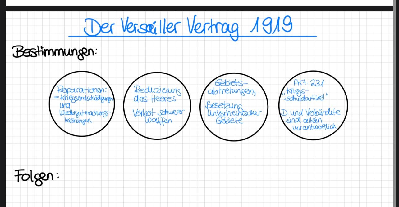 Beide (USA und Großbritannien) waren maßgeblich an den Friedensverhandlungen beteiligt. USA wollte gemäßigte Bedingungen (Wilsons 14 Punkte), Großbritannien forderte dagegen harte Strafen für Deutschland. 2. Infos aus dem Text zur Dolchstoßlegende (mit Bezug zum Versailler Vertrag): Kriegsniederlage war Schock für viele Deutsche → passte nicht zum Bild eines "starken Heeres". Friedrich Ebert (später Reichspräsident): Sagte: „Kein Feind hat euch überwunden!“ Deutete an, dass das Militär nicht militärisch besiegt wurde. Dolchstoßlegende entstand: Behauptung: Das deutsche Heer sei „von hinten erdolcht“ worden – also vom eigenen Volk. Schuld wurde der Zivilbevölkerung, Pazifisten, Sozialisten und Politikern zugeschoben. Kritik am Friedensvertrag: Vertrag von Versailles galt vielen als „Diktatfrieden“. Matthias Erzberger, der den Waffenstillstand mit unterzeichnete, wurde dafür 1921 ermordet. Legende diente als Erklärung: Warum Deutschland verlor, obwohl viele glaubten, das Militär sei unbesiegt gewesen. Verstärkte Ablehnung gegen den Versailler Vertrag. Trug zur politischen Radikalisierung und Instabilität der Weimarer Republik bei.