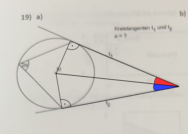 Also, wenn du ne Tangente zu nem Kreis hast, dann kannst du ein rechtwinkliges Dreieck machen. Warum? Weil die Tangente genau 90° zum Kreisbogen hat, du kannst also an dieser Stelle eine rechtwinklige Verbindung zum Mittelpunkt machen.