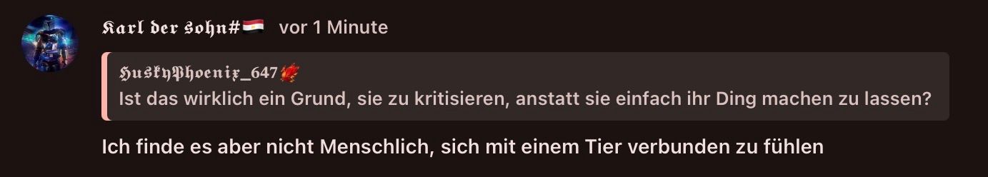 Ich akzeptiere, dass es Therians gibt, und finde das auch tatsächlich nicht unnormal. Vielleicht labere ich auch, zumindest nach eurer aller Meinung, jetzt Bullshit, aber für mich gibt es auch keine richtige Norm. Natürlich, es gibt die Mehrheit und die Minderheit. Aber ich denke, dass weder das eine noch das andere wirklich die Norm bilden