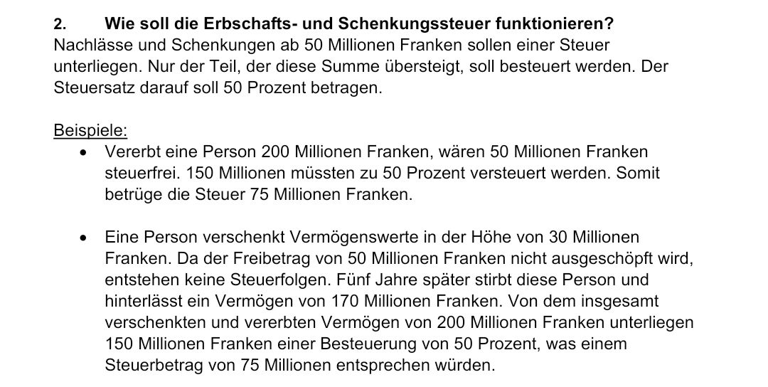 "Neu soll der Bund zusätzlich eine Steuer von 50 Prozent auf den Nachlass und die Schenkungen einer Person erheben, wobei die ersten 50 Millionen Franken nicht besteuert werden."