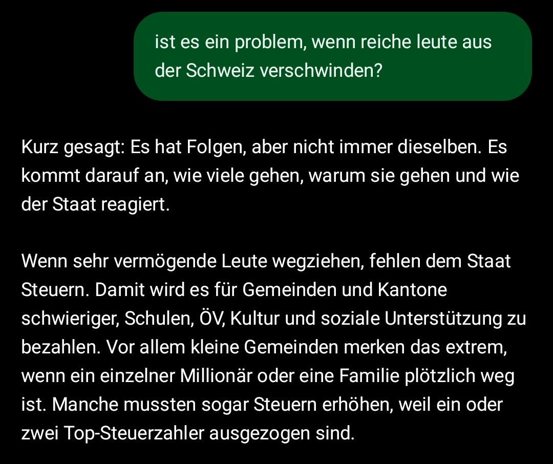 Okay, rechnen wir mal das Szenario durch. Was passiert mit all den Familien unternehmen, die der Schweiz überhaupt die Stabilität der Wirtschaft ermöglicht hat? einfach futsch?
