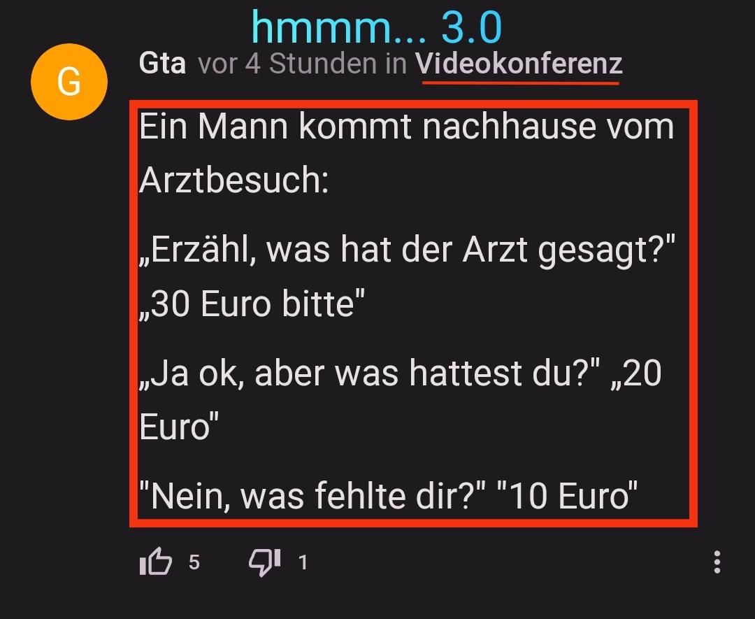 VielZuDumm#gegen mobbingvor 3 JahrenDie Behandlung hatte 30€ gekostet, aber der Mann hatte nur 20€ dabei. Also konnte er dem Arzt nicht alles bezahlen, ihm haben 10€ gefehlt