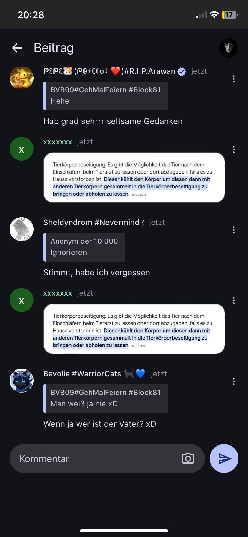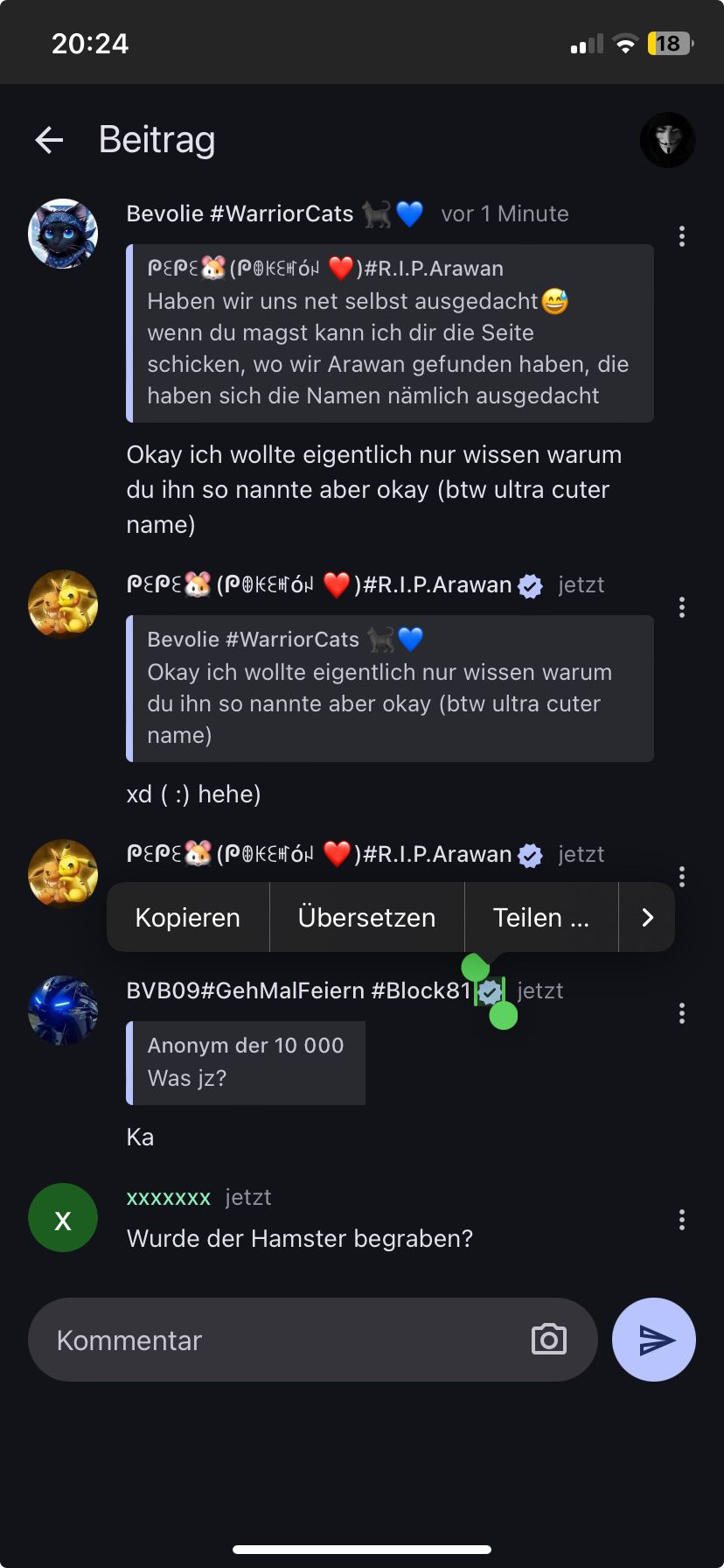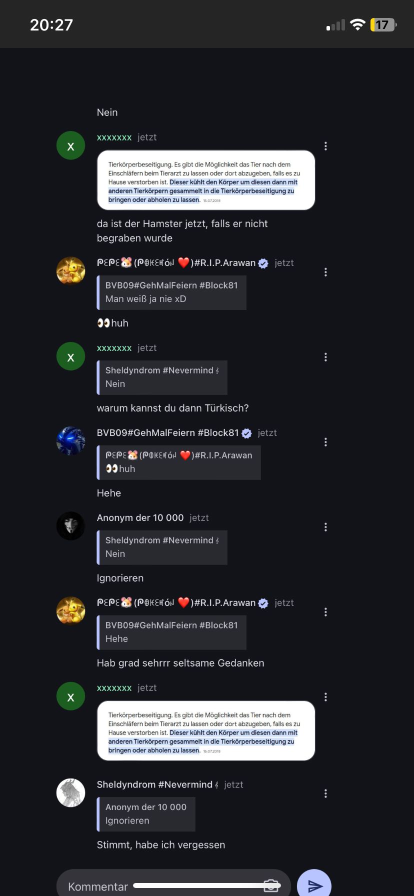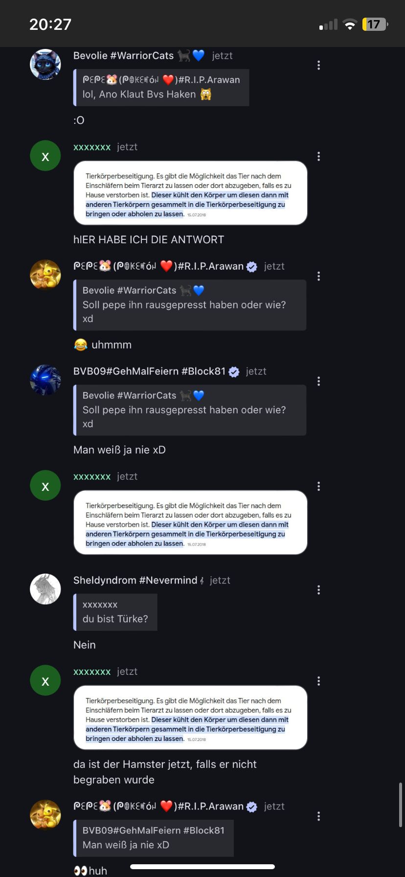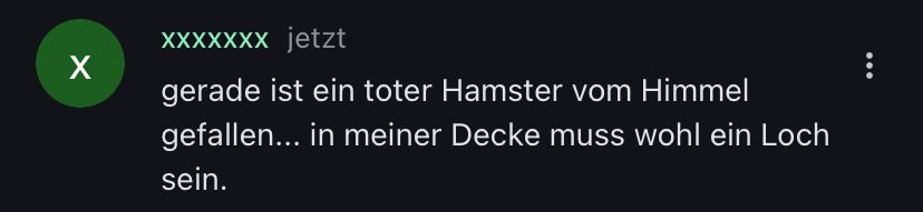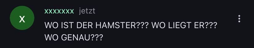 Also, was ist mit dem Hamster passiert, nachdem er starb? Wo ist er jetzt? Entweder du antwortest, oder ich werde die ganze Seite vollspammen