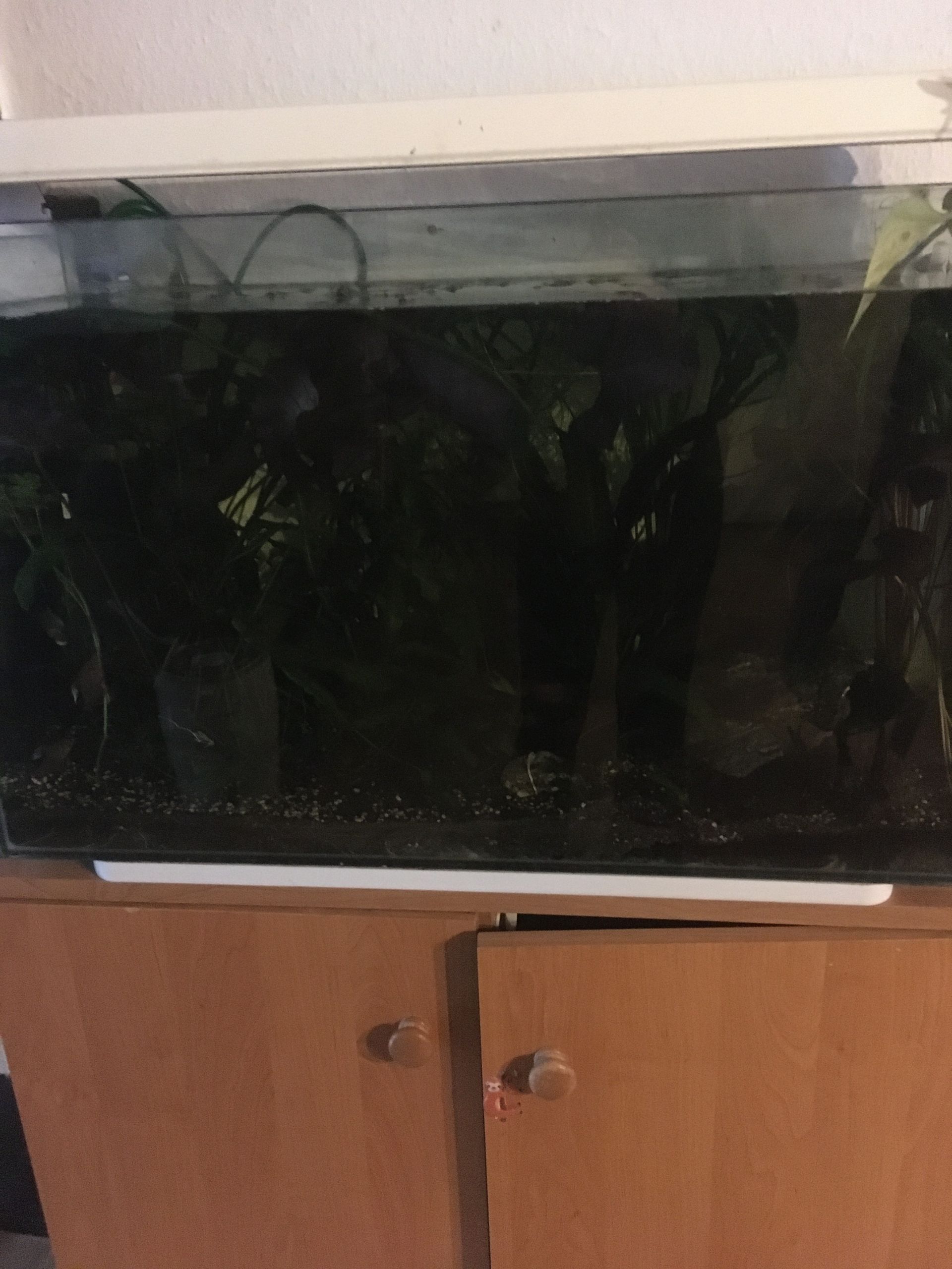 Wir haben drei Welse, einen großen und zwei kleine, einen Honiggurami und Schmucksalmer