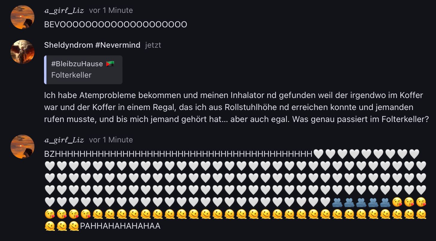 Ich habe Atemprobleme bekommen und meinen Inhalator nd gefunden weil der irgendwo im Koffer war und der Koffer in einem Regal, das ich aus Rollstuhlhöhe nd erreichen konnte und jemanden rufen musste, und bis mich jemand gehört hat… aber auch egal. Was genau passiert im Folterkeller?