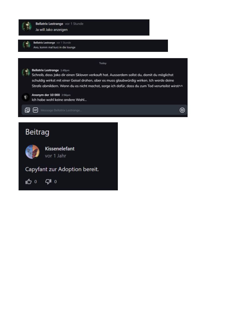 Leute, was ist eigentlich von meiner Idee von einem Jahr? Ich finde die eigentlich ganz lustig: "Gerichtssaal. Hier werden alle Klagen gegen User gemacht und es wird ganz demokratisch geklärt, ob man freigesprochen wird oder ob man elendig hingerichtet wird."