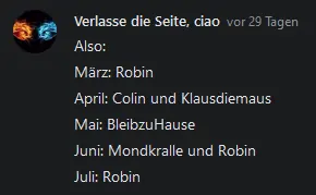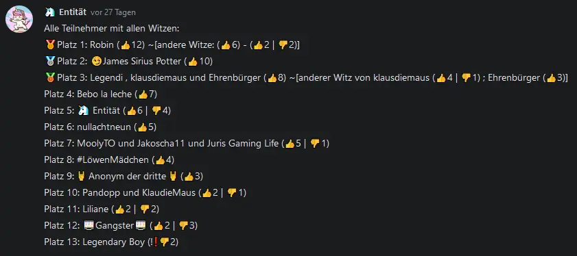 Ich habe beim letzten Mal eine Auflistung aller Teilnehmer gemacht und auf welchem Platz sie waren, dazu kamen auch Dislikes 👎 im Spiel. Wenn 2 Leute gleich viele Likes 👍 hatten, dann wurde der der mehr 👎 hatte runtergestuft.