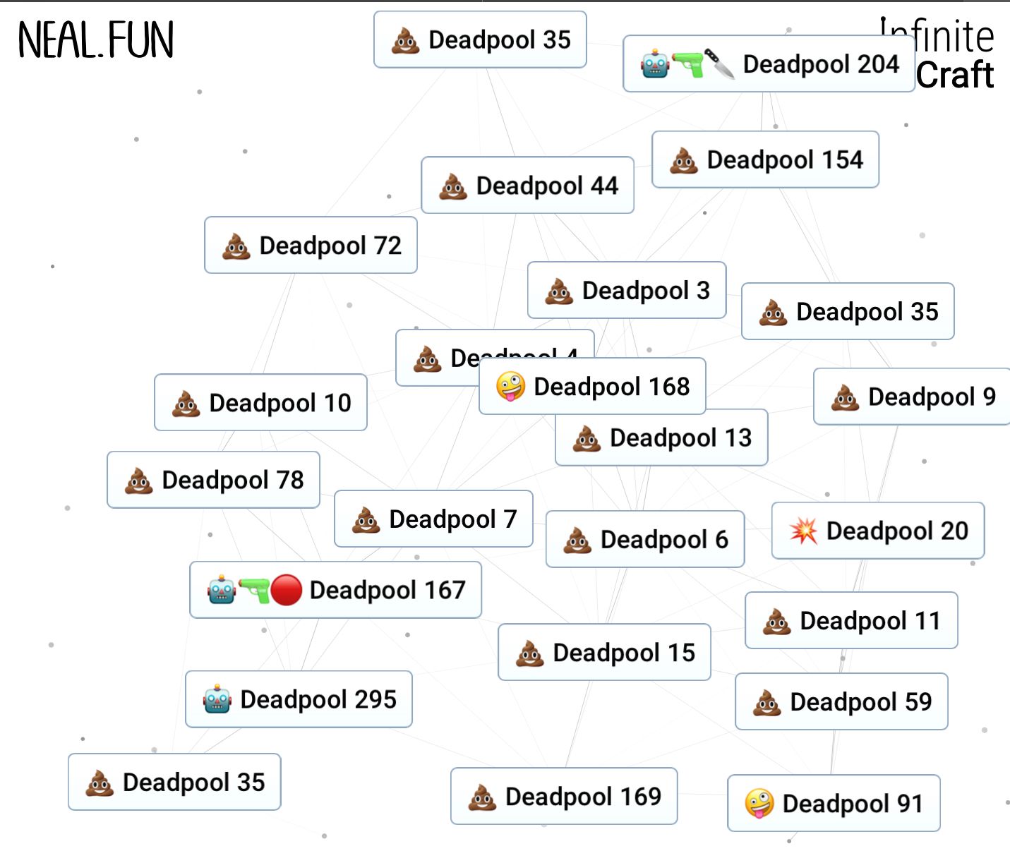 Infinite Craft. Ein Spiel bei dem du mit 3-4 Wörtern anfängst und diese zu neuen verbindest. Irgendwann kommen dann so verrückte Wörter raus wie die in den oberen Bildern oder auch "Amerika" "Putin" "Japan" "Anime" "Spiderman"