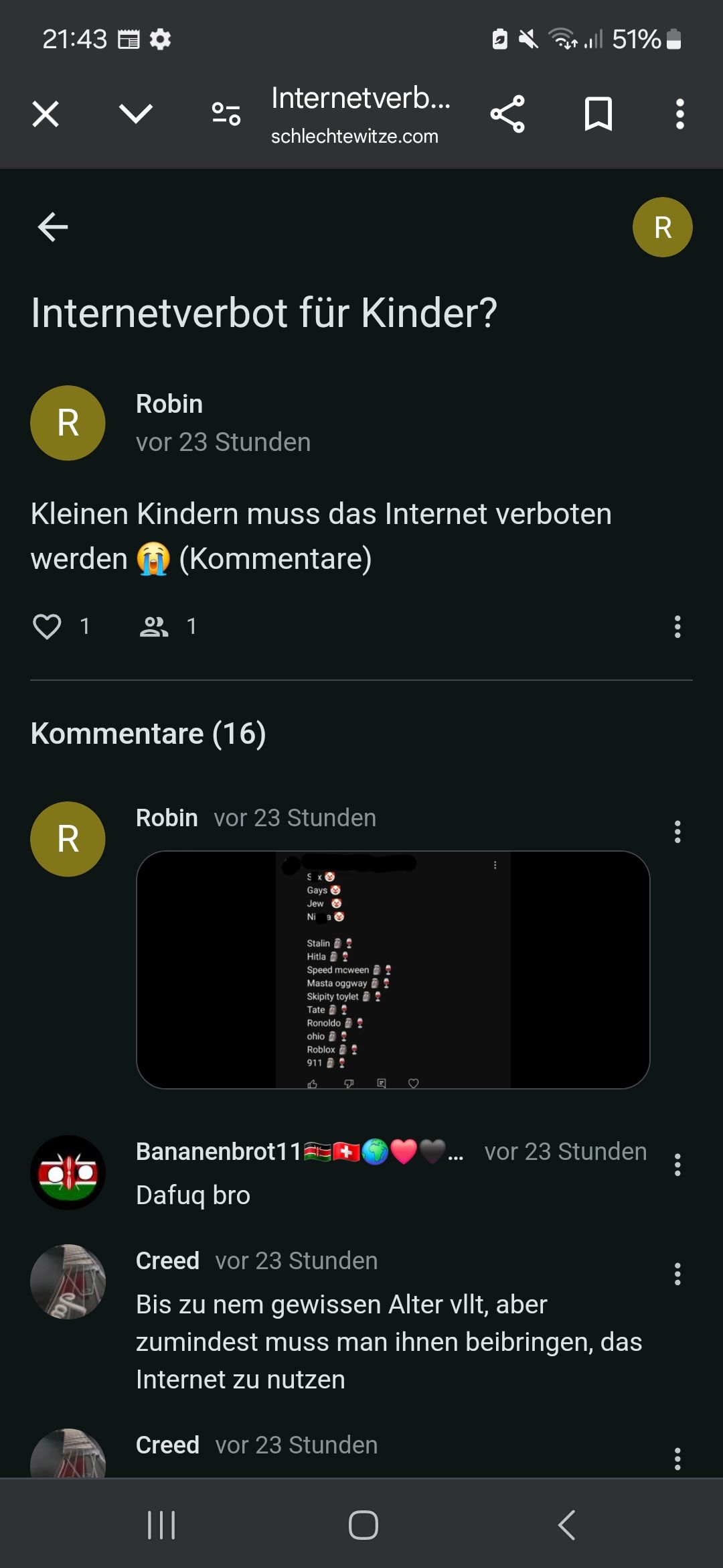Ich denke mal eher, Anonym wollte Oogway damit beleidigen. Ey Colin du Dumpfbacke, du checkst wohl gar nix. Also, hey, ich erkläre dir es. In der Überschrift meine ich ja, Kinder sollte das Internet verboten werden. Anonym meint Oogway ist aber schon 16, was sagen soll, dass Oogy das Internet verboten werden soll. So habe ich das verstanden. Erklärbär.