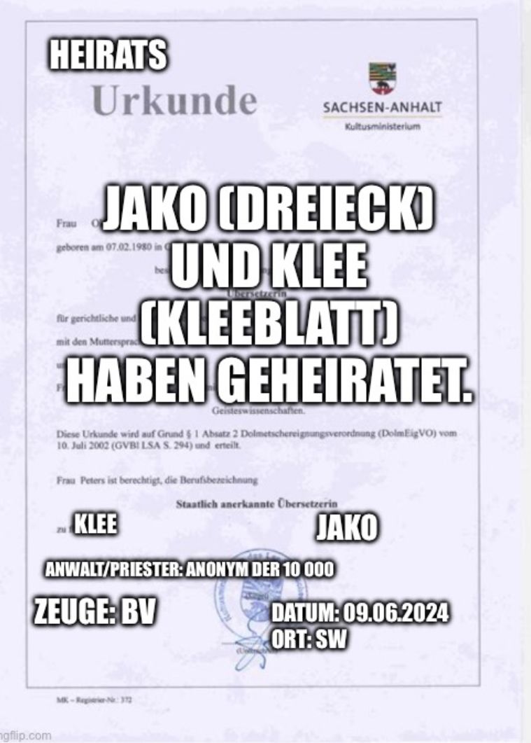 Anonym der 10 000vor 1 JahrJako und Klee haben soeben offiziell geheiratet:D Herzlichen Glückwunsch! (Heiratsurkunde ist in den Kommentaren)