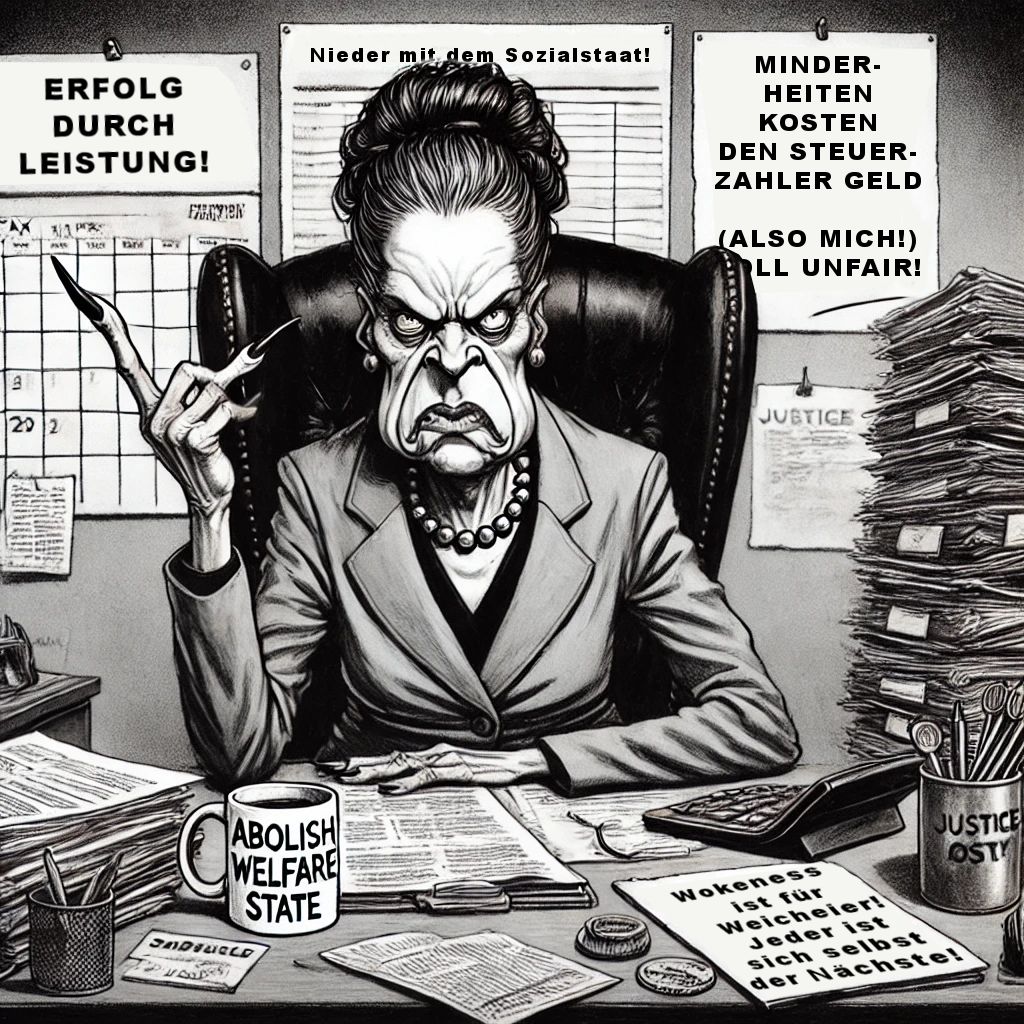 Ist es auch. Beides. Genau genommen hab ich nicht einmal den Prompt selbst erstellt, sondern die KI gefragt, wie sie jeweils eine Person zeichnen würde, die a) Ende 50 ist, einen Bürojob hat, verbittert ist, auf Minderheiten herumhackt - eben so der Typ böse Hexe. Oder die b) eine 16jährige Stubenhockerin ist, die außer Essen und vor dem Internet hocken keine Interessen hat - eben so der Typ kindlich-naives Doofchen.