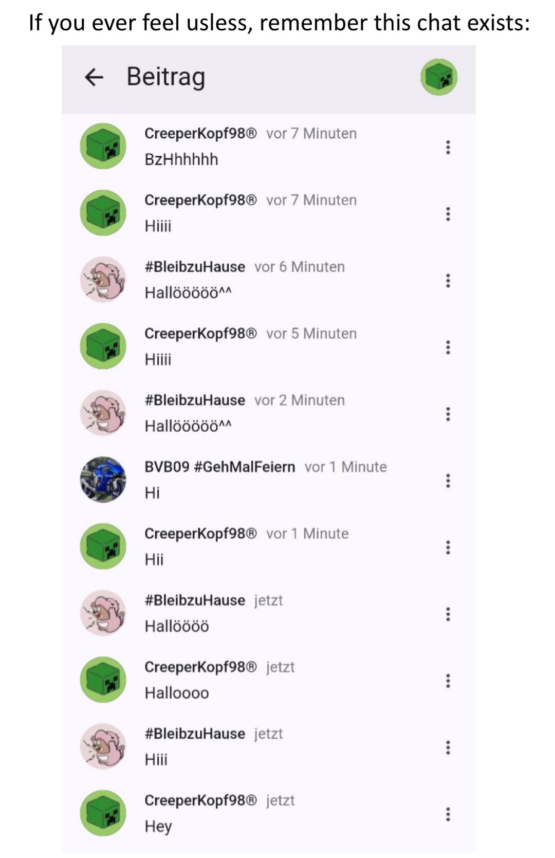 Anonymvor 2 JahrenAnоnуmwrm nd??Bin hier, wenn du jmd zum reden brauchst oder halt so allgemein jmd der dir zuhört