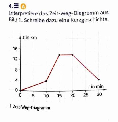 in 10 min ist das fahrrad (oder was auch immer ig) 4km gefahren, dann hat es beschleunigt und hat in 5 min ca. 10 km zurückgelegt. danach ist es für 5 min stehen geblieben.