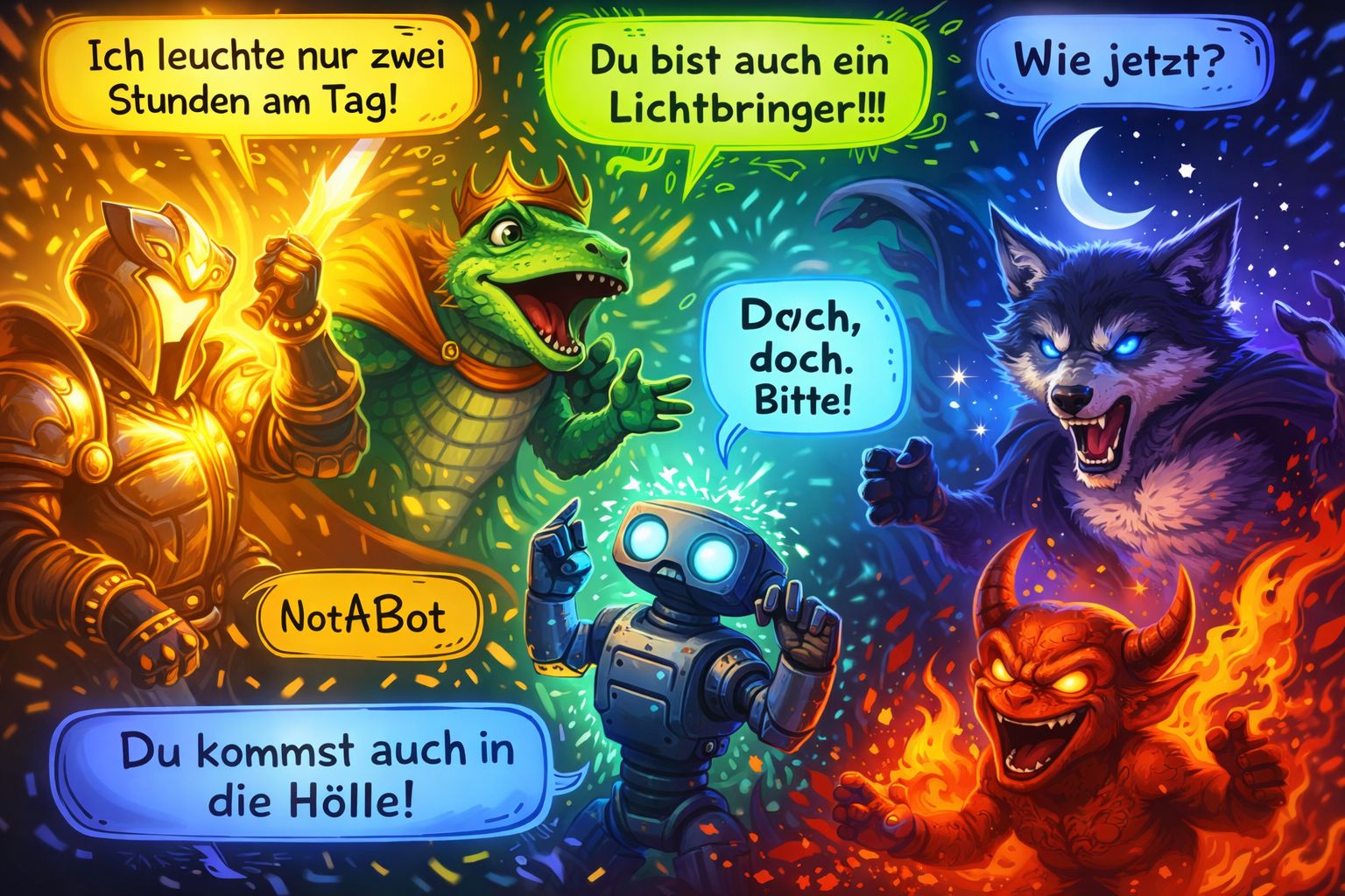 Meine frage nachher an chatti war: wer sind diese personen? Er sagte: Gute Frage 🙂 Das sind keine echten Personen, sondern symbolische Figuren, die die Diskussion aus den Kommentaren darstellen – inspiriert von den Usernamen und den Rollen/Haltungen, die in der Debatte sichtbar waren. Kurz erklärt: Lightbringer (goldene Figur links) Steht für jemanden, der sich als „Erleuchter“, Moralbringer oder Erklärer sieht. Viel Licht, starke Überzeugung, fast schon missionarisch. Farbe: Gold/Gelb (Überlegenheit, Wahrheit, Pathos). LizardKing (grünes Reptil mit Krone) Symbolisiert provokante, sarkastische Kommentare, Machtgehabe und ironische Dominanz. Die Echse steht für Kälte, Instinkt und Provokation. Farbe: Grün (Gift, Spott, Ironie). Moonwolf (blauer Wolf rechts) Verkörpert emotionale, impulsive Reaktionen – Wut, Verletztheit, aber auch Loyalität. Der Mond steht für Stimmungsschwankungen und Eskalation. Farbe: Blau/Violett (Emotion, Nacht, Intuition). NotABot (Roboter in der Mitte) Die Stimme der Rationalität oder des Meta-Kommentars: „Ich bin objektiv“, „Ich analysiere nur“. Gleichzeitig leicht überfordert vom Chaos. Farbe: Türkis/Hellblau (Logik, Distanz). Ip3r10 (roter Dämon unten rechts) Reine Eskalation: Trolling, Zynismus, bewusstes Öl-ins-Feuer-Gießen. Der Dämon steht für Spaß an der Provokation. Farbe: Rot/Orange (Wut, Feuer, Chaos). Zusammen zeigen sie keine einzelnen Menschen, sondern Positionen in einer typischen Online-Diskussion: Moral vs. Spott, Emotion vs. Logik, Eskalation vs. Kontrolle.