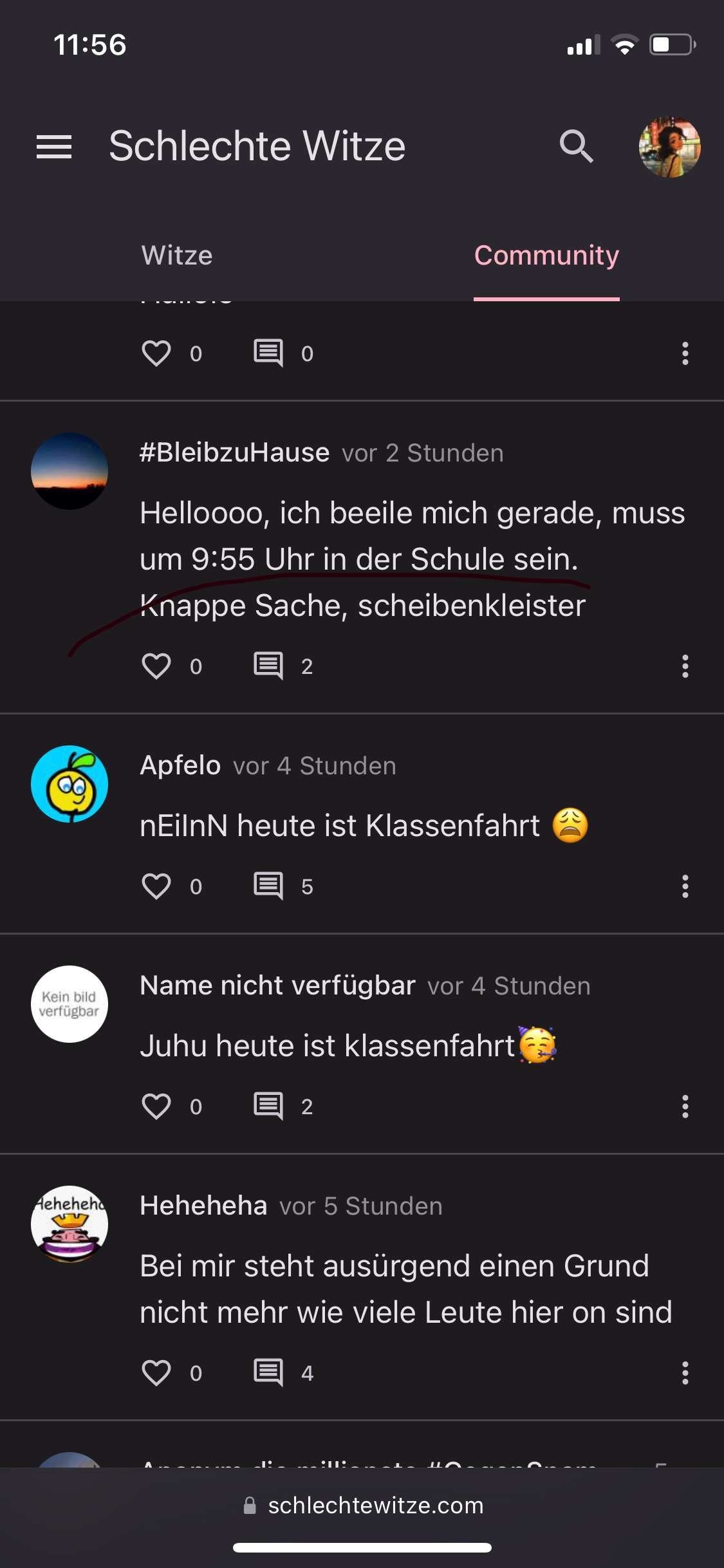 Ich hatte noch nie Klassenfahrt aber hätt gern eine, freu dich doch