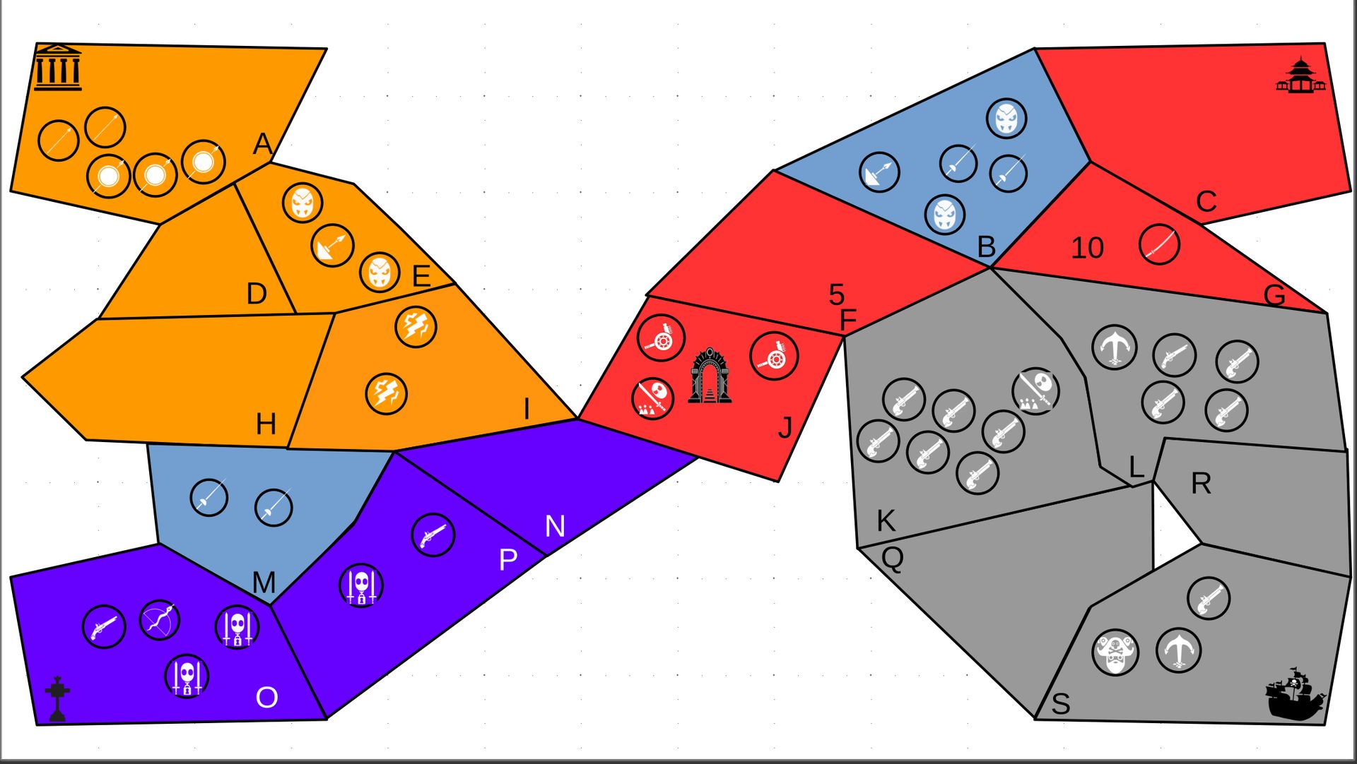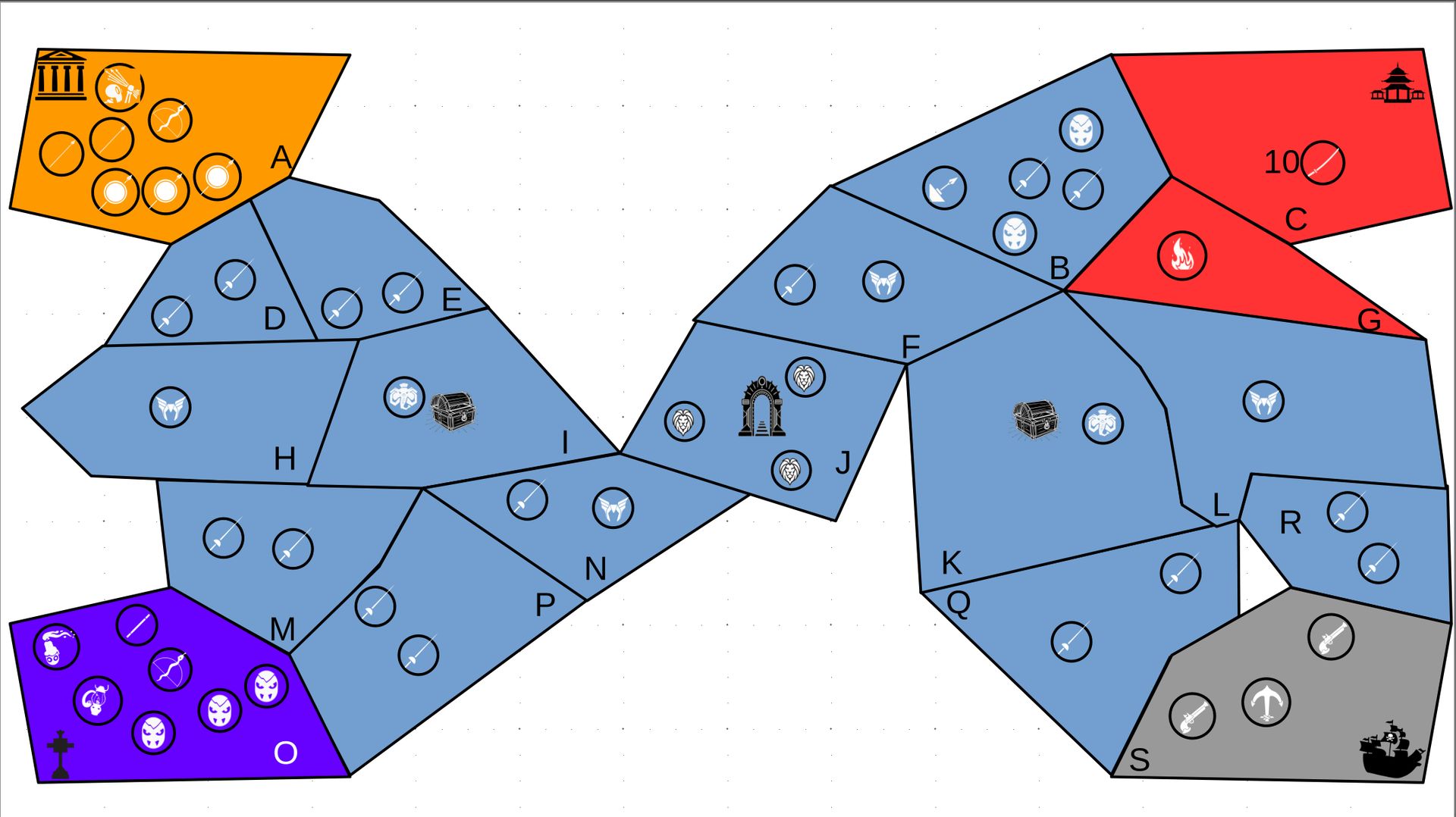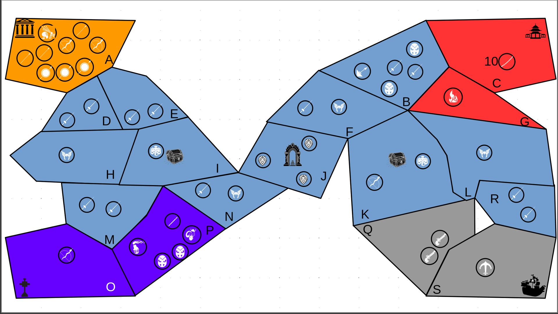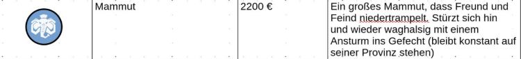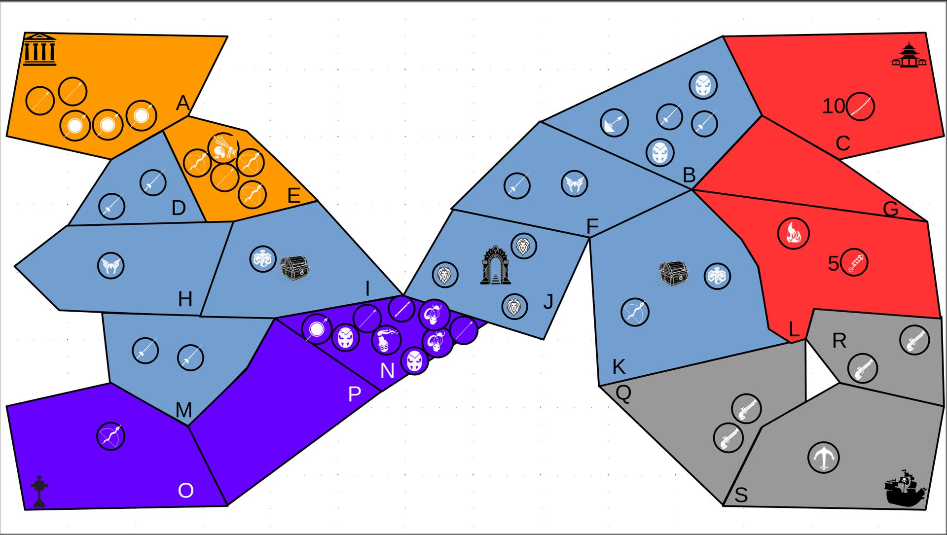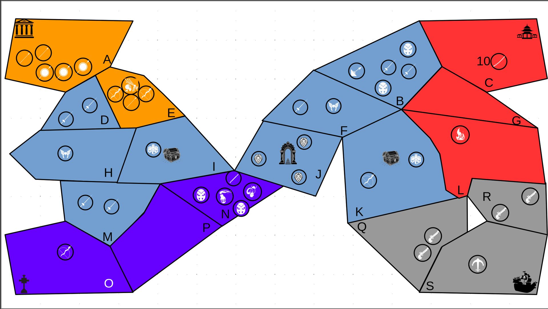 Zuteilung der Fraktionen und Zugreihe: 1. Ano10k - Antike 2. Face- Dynastie 3. Slay - Gruselig 4. SWF - Piraten Spielablauf & Regeln: 1. START-REKRUTIERUNG • erster in Zugreihe fängt an • jeder beginnt mit 3000€ • braucht beliebig viel Geld auf und spart den Rest (wenn nicht alles ausgegeben) für spätere Rekrutierungen • Rekrutierung der fraktionsspezifischen Einheiten (s. Tabelle in Kommis) auf Provinzen (Feldern) in der eigenen Farbe 2. DAS SPIEL [2.a. und 2.b werden übersprungen, wenn 1. der zuletzt ausgeführte Schritt war] 2.a. Einkommen Jeder bekommt das rundenspezifische Einkommen, welches von mir jede Runde deklariert wird und immer mehr wird. Sollte man jedoch seine fraktionsspezifische Hauptstadt (s. Tabelle, Zeichen unter Name der Fraktion) verloren haben, bekommt man nur die Hälfte. 2.b. Rekrutierung • erster in Zugreihe fängt an • braucht beliebig viel Geld auf und spart den Rest (wenn nicht alles ausgegeben) für spätere Rekrutierungen • Rekrutierung der fraktionsspezifischen Einheiten (s. Tabelle in Kommis) auf Provinzen (Feldern) in der eigenen Farbe 2.c. Bewegung - Erster in Zugreihe fängt an - Jede Einheit kann sich auf 1 benachbarte [Kante an Kante] Provinz bewegen - Mehrere Einheiten von einer Provinz können sich zusammen bewegen - Wenn auf Gegnerisches Feld (andere Farbe) gezogen wird: A) Es stehen keine gegnerischen Einheiten drin →Provinz wechselt direkt zu deiner Farbe. War dies die letzte Provinz des Anderen, scheidet der Andere aus dem Spiel aus. B) Es stehen gegnerischen Einheiten drin → Ein Kampf entsteht, der von mir simuliert wird. Mit einer kleinen „Geschichte“ deklariere ich danach das Ergebnis sowie Verluste B.a) der Angreifer gewinnt - der Verteidiger verliert alle Einheiten. Alle überlebenden Einheiten des Angreifers bewegen sich auf die angegriffene Provinz und die Provinz wechselt zu der Farbe des Angreifers. War dies die letzte Provinz des Verteidigers, scheidet er aus dem Spiel aus. B.b) der Verteidiger gewinnt - der Angreifer verliert alle Einheiten. Alle überlebenden Einheiten des Verteidigers bleiben stehen. Keine Provinz wechselt die Farbe. 3. ENDE Das Spiel endet, wenn keiner mehr Lust hat, viele gehen müssen oder nur einer übrig ist. Sollte dies noch nicht der Falls sein, beginnt die Runde wieder bei 2! Ansonsten gewinnt der Mit dem meisten Territorium (bei Gleichstand der mit den meisten Hauptstädten) und wird mit der Anzahl an Siegen in diesem Event (wenn es mehrere gibt) in jedem neuen Event-Beitrag erwähnt.