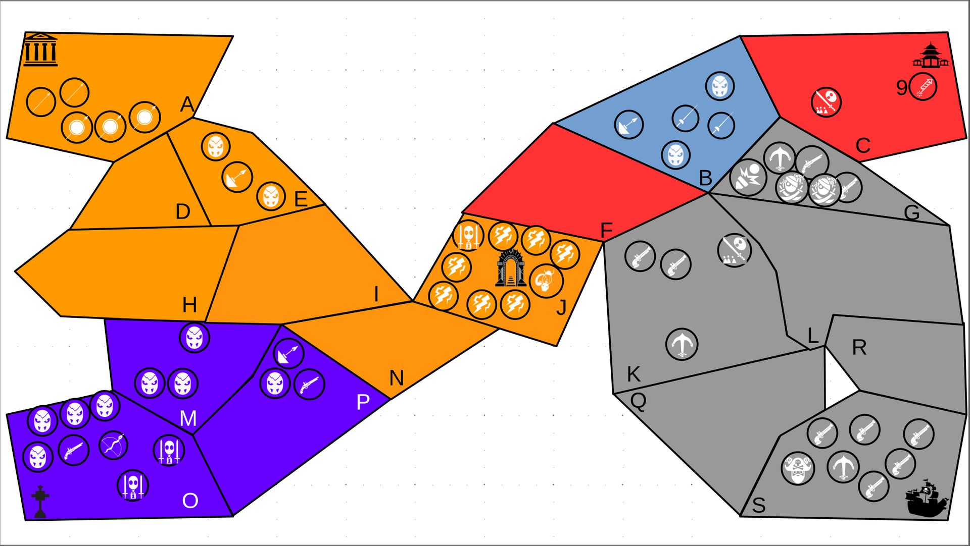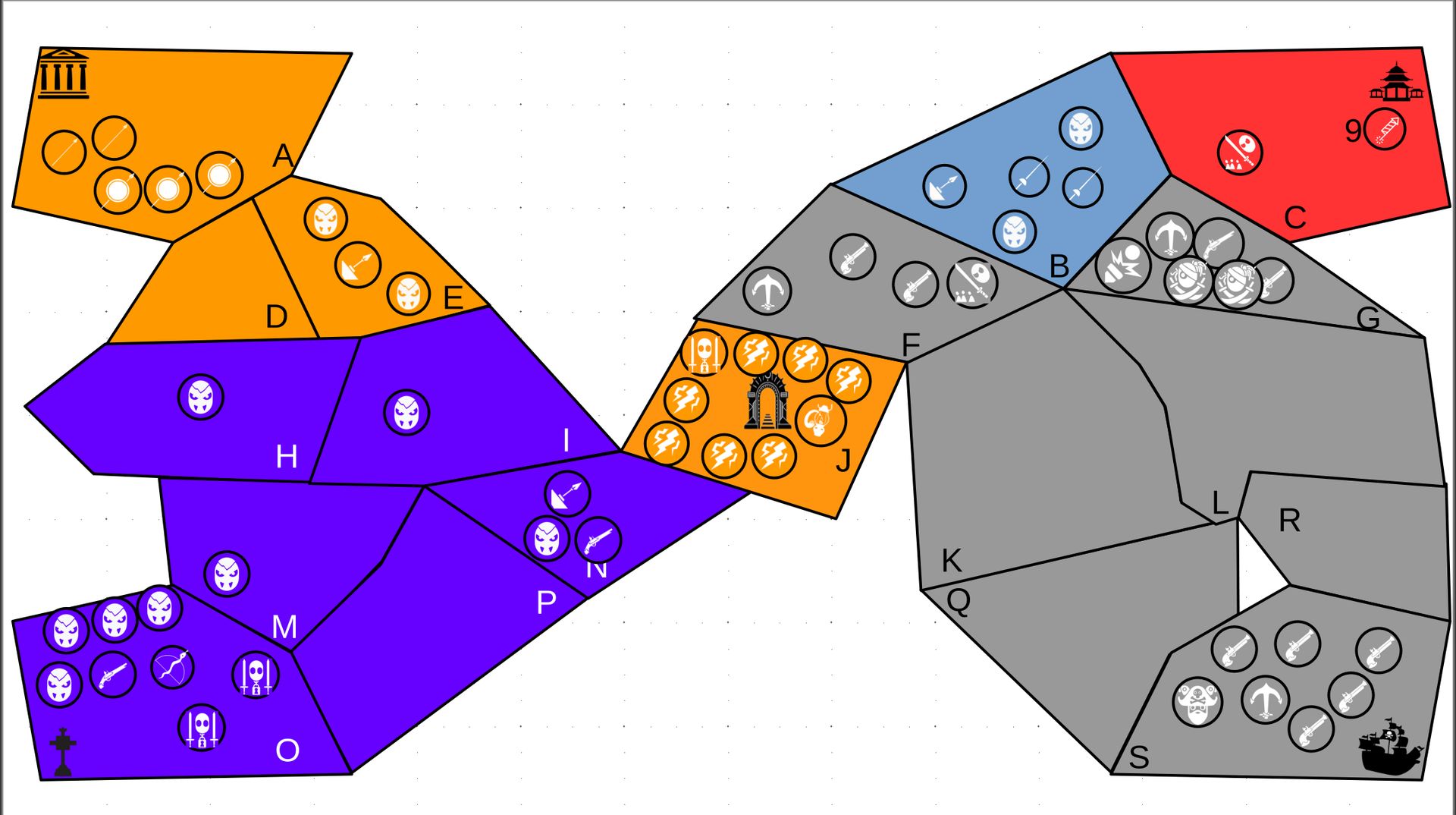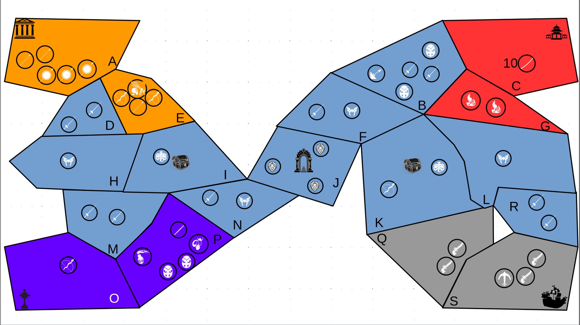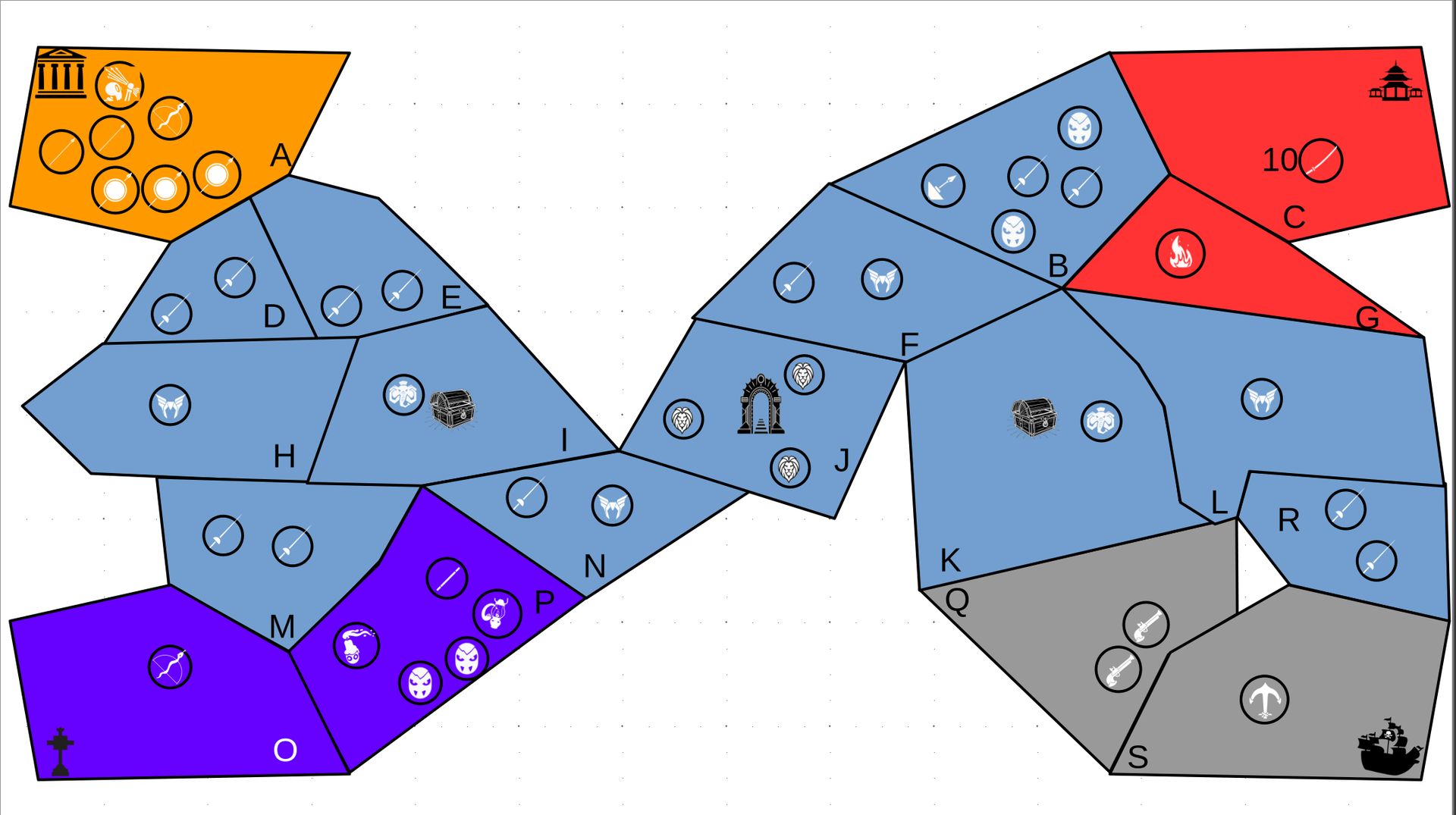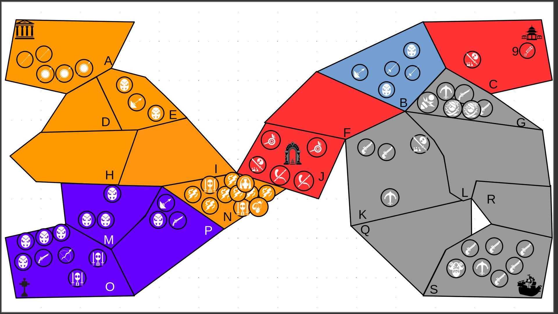 Zuteilung der Fraktionen und Zugreihe: 1. Ano10k - Antike 2. Face- Dynastie 3. Slay - Gruselig 4. SWF - Piraten Spielablauf & Regeln: 1. START-REKRUTIERUNG • erster in Zugreihe fängt an • jeder beginnt mit 3000€ • braucht beliebig viel Geld auf und spart den Rest (wenn nicht alles ausgegeben) für spätere Rekrutierungen • Rekrutierung der fraktionsspezifischen Einheiten (s. Tabelle in Kommis) auf Provinzen (Feldern) in der eigenen Farbe 2. DAS SPIEL [2.a. und 2.b werden übersprungen, wenn 1. der zuletzt ausgeführte Schritt war] 2.a. Einkommen Jeder bekommt das rundenspezifische Einkommen, welches von mir jede Runde deklariert wird und immer mehr wird. Sollte man jedoch seine fraktionsspezifische Hauptstadt (s. Tabelle, Zeichen unter Name der Fraktion) verloren haben, bekommt man nur die Hälfte. 2.b. Rekrutierung • erster in Zugreihe fängt an • braucht beliebig viel Geld auf und spart den Rest (wenn nicht alles ausgegeben) für spätere Rekrutierungen • Rekrutierung der fraktionsspezifischen Einheiten (s. Tabelle in Kommis) auf Provinzen (Feldern) in der eigenen Farbe 2.c. Bewegung - Erster in Zugreihe fängt an - Jede Einheit kann sich auf 1 benachbarte [Kante an Kante] Provinz bewegen - Mehrere Einheiten von einer Provinz können sich zusammen bewegen - Wenn auf Gegnerisches Feld (andere Farbe) gezogen wird: A) Es stehen keine gegnerischen Einheiten drin →Provinz wechselt direkt zu deiner Farbe. War dies die letzte Provinz des Anderen, scheidet der Andere aus dem Spiel aus. B) Es stehen gegnerischen Einheiten drin → Ein Kampf entsteht, der von mir simuliert wird. Mit einer kleinen „Geschichte“ deklariere ich danach das Ergebnis sowie Verluste B.a) der Angreifer gewinnt - der Verteidiger verliert alle Einheiten. Alle überlebenden Einheiten des Angreifers bewegen sich auf die angegriffene Provinz und die Provinz wechselt zu der Farbe des Angreifers. War dies die letzte Provinz des Verteidigers, scheidet er aus dem Spiel aus. B.b) der Verteidiger gewinnt - der Angreifer verliert alle Einheiten. Alle überlebenden Einheiten des Verteidigers bleiben stehen. Keine Provinz wechselt die Farbe. 3. ENDE Das Spiel endet, wenn keiner mehr Lust hat, viele gehen müssen oder nur einer übrig ist. Sollte dies noch nicht der Falls sein, beginnt die Runde wieder bei 2! Ansonsten gewinnt der Mit dem meisten Territorium (bei Gleichstand der mit den meisten Hauptstädten) und wird mit der Anzahl an Siegen in diesem Event (wenn es mehrere gibt) in jedem neuen Event-Beitrag erwähnt.