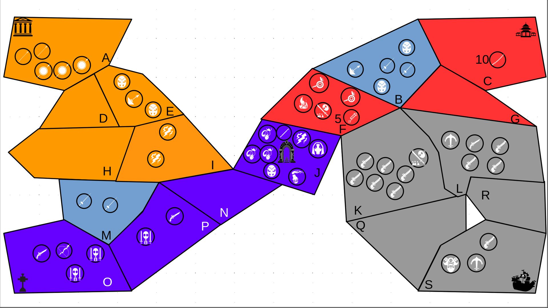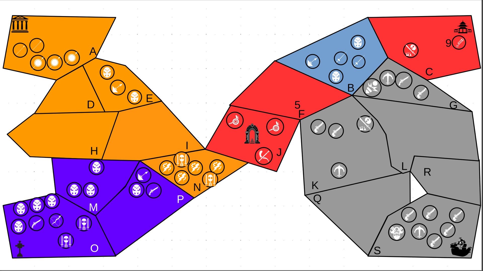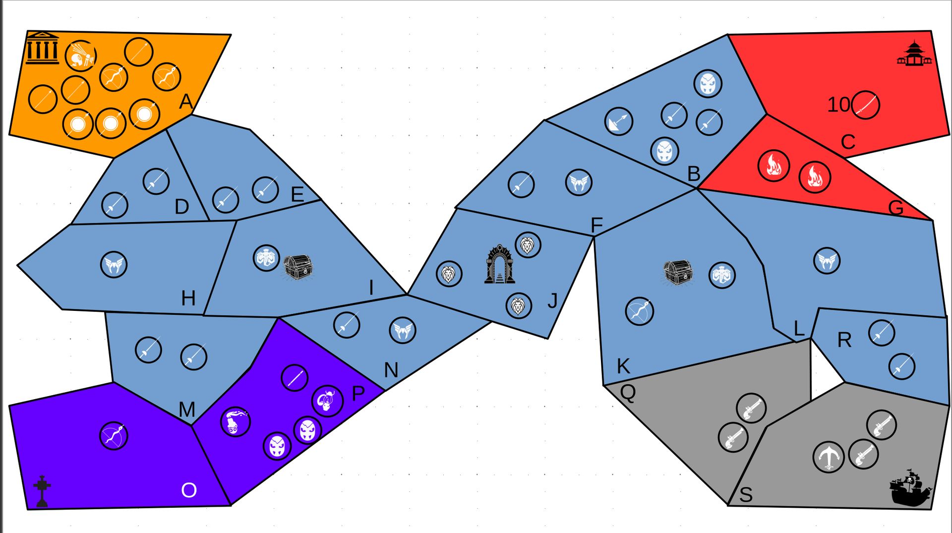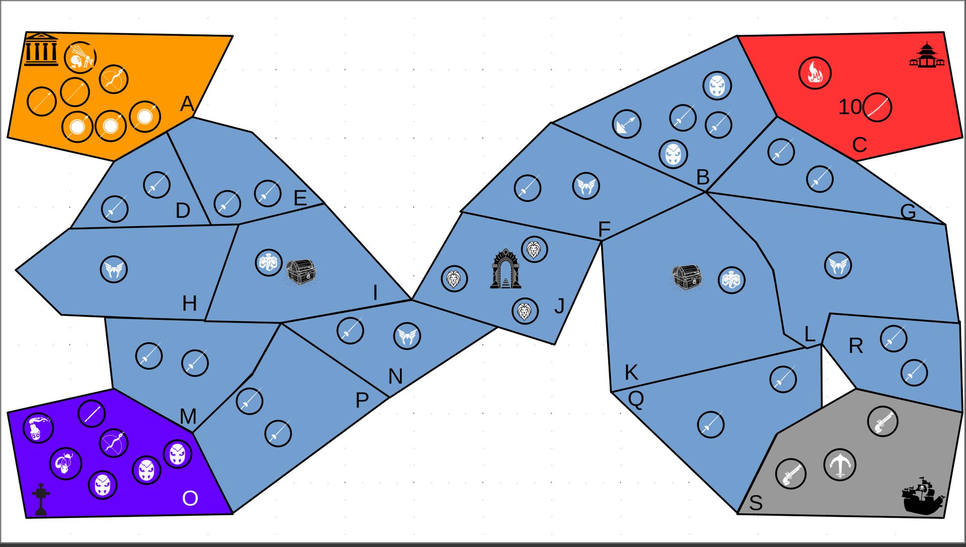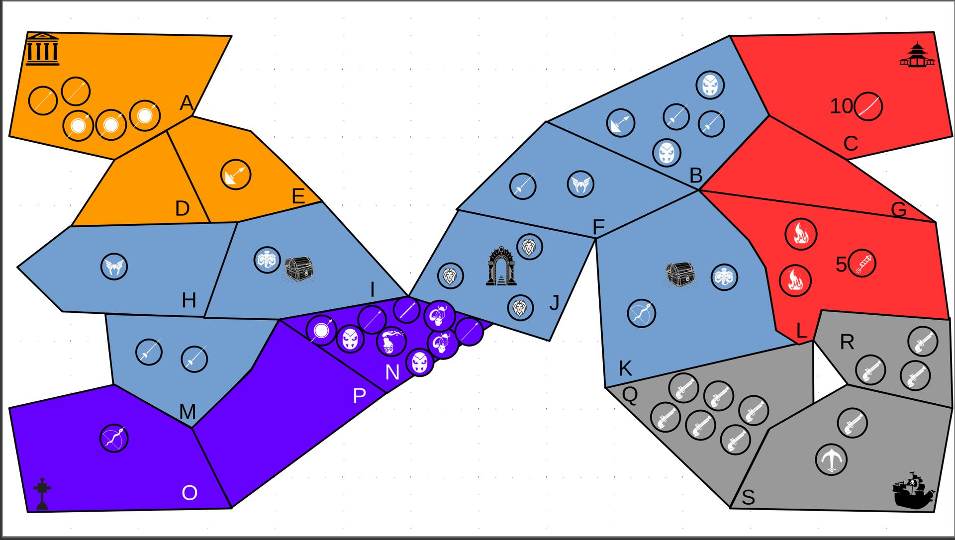 Zuteilung der Fraktionen und Zugreihe: 1. Ano10k - Antike 2. Face- Dynastie 3. Slay - Gruselig 4. SWF - Piraten Spielablauf & Regeln: 1. START-REKRUTIERUNG • erster in Zugreihe fängt an • jeder beginnt mit 3000€ • braucht beliebig viel Geld auf und spart den Rest (wenn nicht alles ausgegeben) für spätere Rekrutierungen • Rekrutierung der fraktionsspezifischen Einheiten (s. Tabelle in Kommis) auf Provinzen (Feldern) in der eigenen Farbe 2. DAS SPIEL [2.a. und 2.b werden übersprungen, wenn 1. der zuletzt ausgeführte Schritt war] 2.a. Einkommen Jeder bekommt das rundenspezifische Einkommen, welches von mir jede Runde deklariert wird und immer mehr wird. Sollte man jedoch seine fraktionsspezifische Hauptstadt (s. Tabelle, Zeichen unter Name der Fraktion) verloren haben, bekommt man nur die Hälfte. 2.b. Rekrutierung • erster in Zugreihe fängt an • braucht beliebig viel Geld auf und spart den Rest (wenn nicht alles ausgegeben) für spätere Rekrutierungen • Rekrutierung der fraktionsspezifischen Einheiten (s. Tabelle in Kommis) auf Provinzen (Feldern) in der eigenen Farbe 2.c. Bewegung - Erster in Zugreihe fängt an - Jede Einheit kann sich auf 1 benachbarte [Kante an Kante] Provinz bewegen - Mehrere Einheiten von einer Provinz können sich zusammen bewegen - Wenn auf Gegnerisches Feld (andere Farbe) gezogen wird: A) Es stehen keine gegnerischen Einheiten drin →Provinz wechselt direkt zu deiner Farbe. War dies die letzte Provinz des Anderen, scheidet der Andere aus dem Spiel aus. B) Es stehen gegnerischen Einheiten drin → Ein Kampf entsteht, der von mir simuliert wird. Mit einer kleinen „Geschichte“ deklariere ich danach das Ergebnis sowie Verluste B.a) der Angreifer gewinnt - der Verteidiger verliert alle Einheiten. Alle überlebenden Einheiten des Angreifers bewegen sich auf die angegriffene Provinz und die Provinz wechselt zu der Farbe des Angreifers. War dies die letzte Provinz des Verteidigers, scheidet er aus dem Spiel aus. B.b) der Verteidiger gewinnt - der Angreifer verliert alle Einheiten. Alle überlebenden Einheiten des Verteidigers bleiben stehen. Keine Provinz wechselt die Farbe. 3. ENDE Das Spiel endet, wenn keiner mehr Lust hat, viele gehen müssen oder nur einer übrig ist. Sollte dies noch nicht der Falls sein, beginnt die Runde wieder bei 2! Ansonsten gewinnt der Mit dem meisten Territorium (bei Gleichstand der mit den meisten Hauptstädten) und wird mit der Anzahl an Siegen in diesem Event (wenn es mehrere gibt) in jedem neuen Event-Beitrag erwähnt.