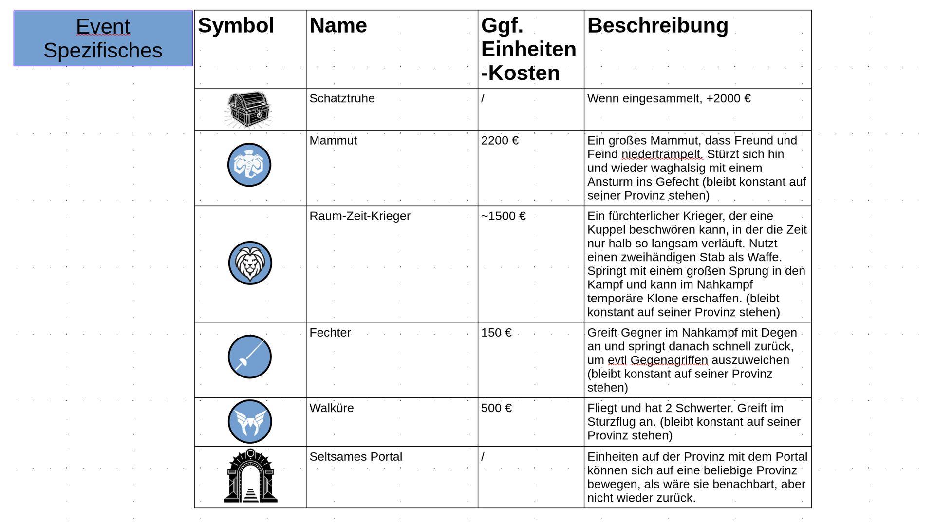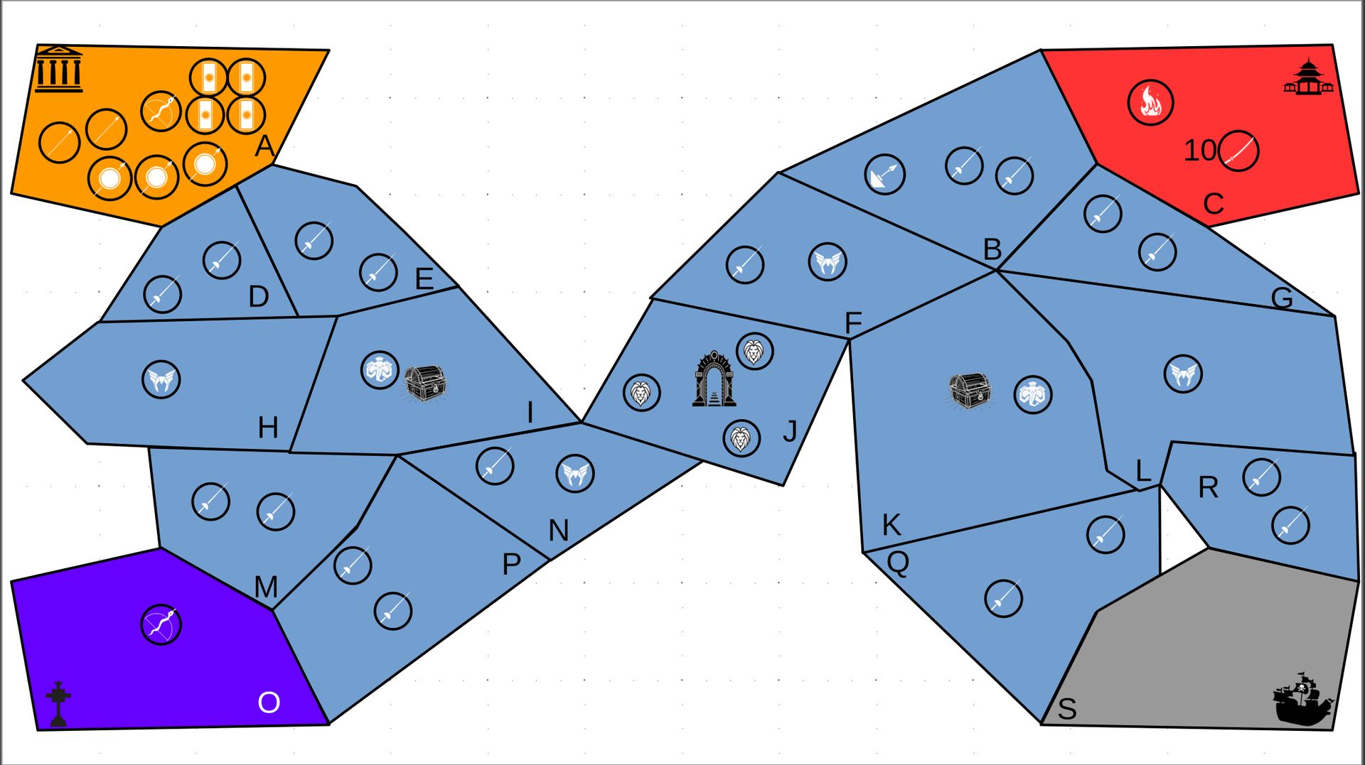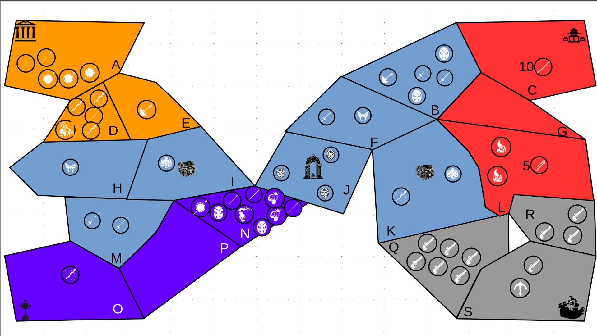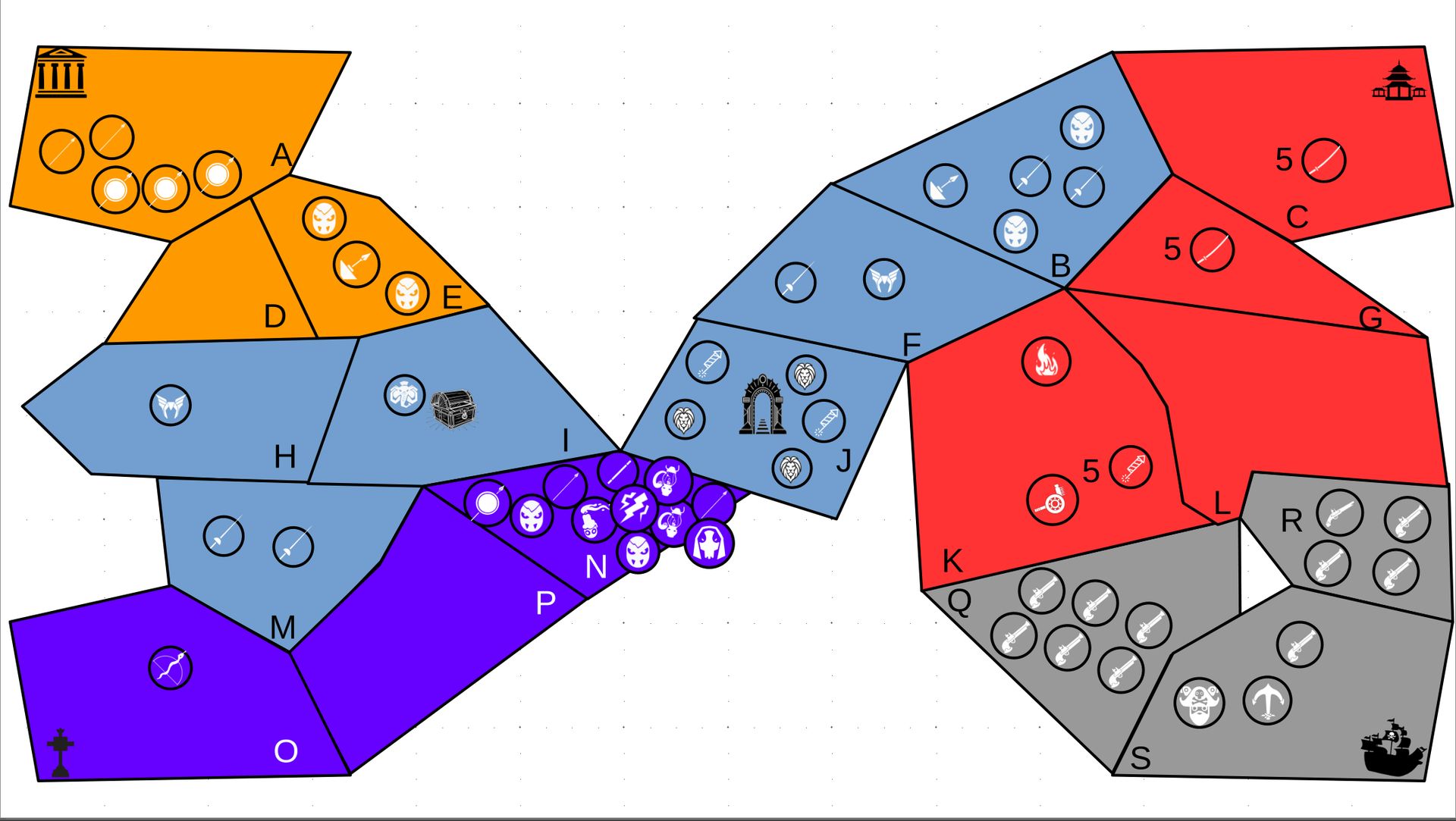 Zuteilung der Fraktionen und Zugreihe: 1. Ano10k - Antike 2. Face- Dynastie 3. Slay - Gruselig 4. SWF - Piraten Spielablauf & Regeln: 1. START-REKRUTIERUNG • erster in Zugreihe fängt an • jeder beginnt mit 3000€ • braucht beliebig viel Geld auf und spart den Rest (wenn nicht alles ausgegeben) für spätere Rekrutierungen • Rekrutierung der fraktionsspezifischen Einheiten (s. Tabelle in Kommis) auf Provinzen (Feldern) in der eigenen Farbe 2. DAS SPIEL [2.a. und 2.b werden übersprungen, wenn 1. der zuletzt ausgeführte Schritt war] 2.a. Einkommen Jeder bekommt das rundenspezifische Einkommen, welches von mir jede Runde deklariert wird und immer mehr wird. Sollte man jedoch seine fraktionsspezifische Hauptstadt (s. Tabelle, Zeichen unter Name der Fraktion) verloren haben, bekommt man nur die Hälfte. 2.b. Rekrutierung • erster in Zugreihe fängt an • braucht beliebig viel Geld auf und spart den Rest (wenn nicht alles ausgegeben) für spätere Rekrutierungen • Rekrutierung der fraktionsspezifischen Einheiten (s. Tabelle in Kommis) auf Provinzen (Feldern) in der eigenen Farbe 2.c. Bewegung - Erster in Zugreihe fängt an - Jede Einheit kann sich auf 1 benachbarte [Kante an Kante] Provinz bewegen - Mehrere Einheiten von einer Provinz können sich zusammen bewegen - Wenn auf Gegnerisches Feld (andere Farbe) gezogen wird: A) Es stehen keine gegnerischen Einheiten drin →Provinz wechselt direkt zu deiner Farbe. War dies die letzte Provinz des Anderen, scheidet der Andere aus dem Spiel aus. B) Es stehen gegnerischen Einheiten drin → Ein Kampf entsteht, der von mir simuliert wird. Mit einer kleinen „Geschichte“ deklariere ich danach das Ergebnis sowie Verluste B.a) der Angreifer gewinnt - der Verteidiger verliert alle Einheiten. Alle überlebenden Einheiten des Angreifers bewegen sich auf die angegriffene Provinz und die Provinz wechselt zu der Farbe des Angreifers. War dies die letzte Provinz des Verteidigers, scheidet er aus dem Spiel aus. B.b) der Verteidiger gewinnt - der Angreifer verliert alle Einheiten. Alle überlebenden Einheiten des Verteidigers bleiben stehen. Keine Provinz wechselt die Farbe. 3. ENDE Das Spiel endet, wenn keiner mehr Lust hat, viele gehen müssen oder nur einer übrig ist. Sollte dies noch nicht der Falls sein, beginnt die Runde wieder bei 2! Ansonsten gewinnt der Mit dem meisten Territorium (bei Gleichstand der mit den meisten Hauptstädten) und wird mit der Anzahl an Siegen in diesem Event (wenn es mehrere gibt) in jedem neuen Event-Beitrag erwähnt.