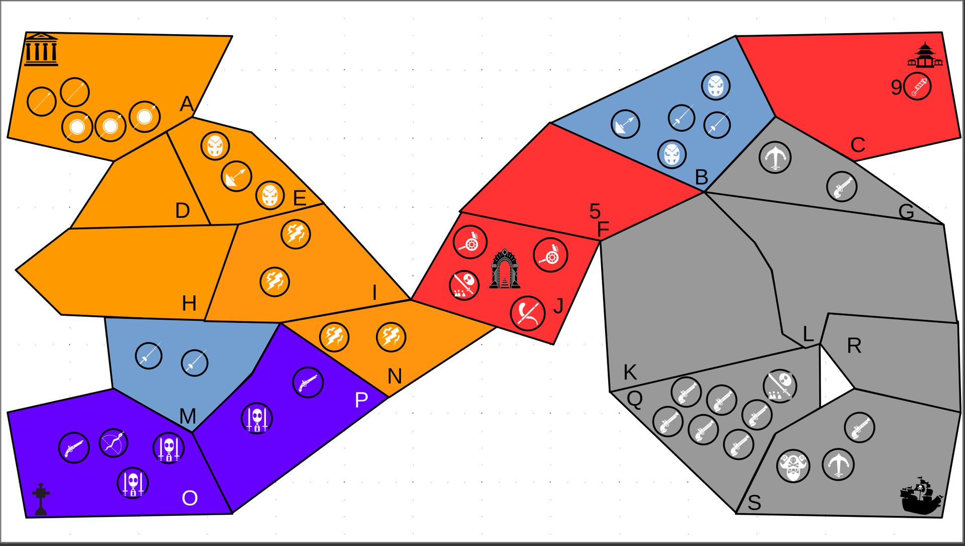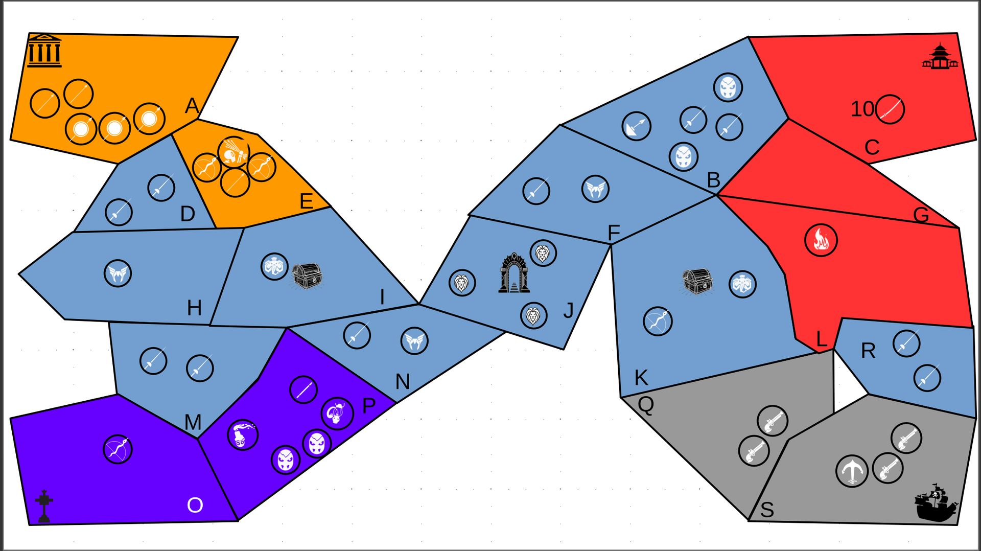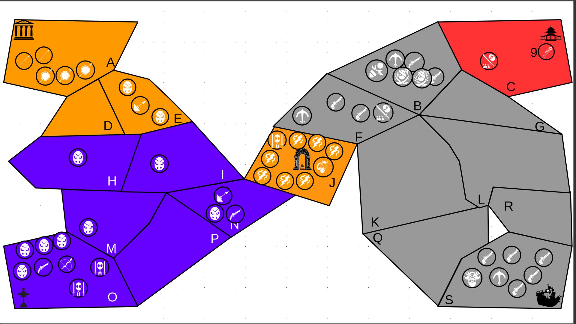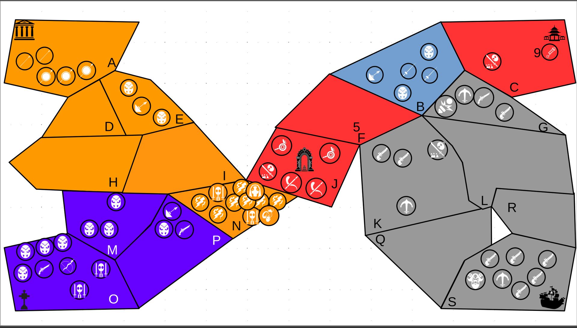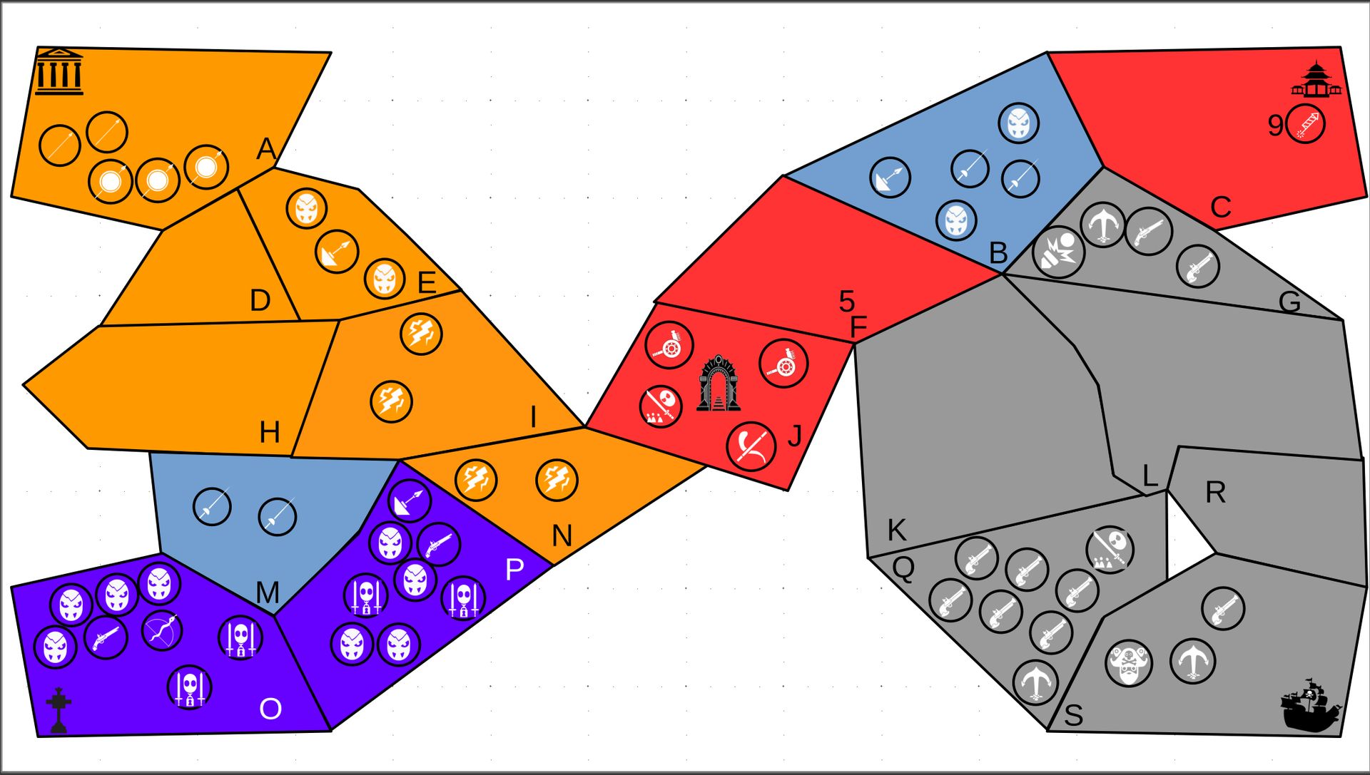 Zuteilung der Fraktionen und Zugreihe: 1. Ano10k - Antike 2. Face- Dynastie 3. Slay - Gruselig 4. SWF - Piraten Spielablauf & Regeln: 1. START-REKRUTIERUNG • erster in Zugreihe fängt an • jeder beginnt mit 3000€ • braucht beliebig viel Geld auf und spart den Rest (wenn nicht alles ausgegeben) für spätere Rekrutierungen • Rekrutierung der fraktionsspezifischen Einheiten (s. Tabelle in Kommis) auf Provinzen (Feldern) in der eigenen Farbe 2. DAS SPIEL [2.a. und 2.b werden übersprungen, wenn 1. der zuletzt ausgeführte Schritt war] 2.a. Einkommen Jeder bekommt das rundenspezifische Einkommen, welches von mir jede Runde deklariert wird und immer mehr wird. Sollte man jedoch seine fraktionsspezifische Hauptstadt (s. Tabelle, Zeichen unter Name der Fraktion) verloren haben, bekommt man nur die Hälfte. 2.b. Rekrutierung • erster in Zugreihe fängt an • braucht beliebig viel Geld auf und spart den Rest (wenn nicht alles ausgegeben) für spätere Rekrutierungen • Rekrutierung der fraktionsspezifischen Einheiten (s. Tabelle in Kommis) auf Provinzen (Feldern) in der eigenen Farbe 2.c. Bewegung - Erster in Zugreihe fängt an - Jede Einheit kann sich auf 1 benachbarte [Kante an Kante] Provinz bewegen - Mehrere Einheiten von einer Provinz können sich zusammen bewegen - Wenn auf Gegnerisches Feld (andere Farbe) gezogen wird: A) Es stehen keine gegnerischen Einheiten drin →Provinz wechselt direkt zu deiner Farbe. War dies die letzte Provinz des Anderen, scheidet der Andere aus dem Spiel aus. B) Es stehen gegnerischen Einheiten drin → Ein Kampf entsteht, der von mir simuliert wird. Mit einer kleinen „Geschichte“ deklariere ich danach das Ergebnis sowie Verluste B.a) der Angreifer gewinnt - der Verteidiger verliert alle Einheiten. Alle überlebenden Einheiten des Angreifers bewegen sich auf die angegriffene Provinz und die Provinz wechselt zu der Farbe des Angreifers. War dies die letzte Provinz des Verteidigers, scheidet er aus dem Spiel aus. B.b) der Verteidiger gewinnt - der Angreifer verliert alle Einheiten. Alle überlebenden Einheiten des Verteidigers bleiben stehen. Keine Provinz wechselt die Farbe. 3. ENDE Das Spiel endet, wenn keiner mehr Lust hat, viele gehen müssen oder nur einer übrig ist. Sollte dies noch nicht der Falls sein, beginnt die Runde wieder bei 2! Ansonsten gewinnt der Mit dem meisten Territorium (bei Gleichstand der mit den meisten Hauptstädten) und wird mit der Anzahl an Siegen in diesem Event (wenn es mehrere gibt) in jedem neuen Event-Beitrag erwähnt.